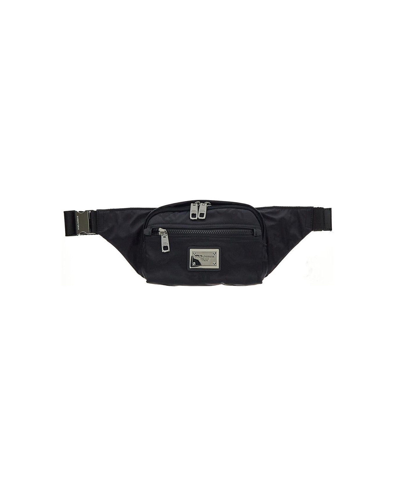 Dolce & Gabbana belt bag in black nylon with all-over tonal DG logo motif, branded silver metal plaque on a patch black leather detail, adjustable tape with snap fastening, front and back zip pockets, a transparent back pocket, double top zip closure, a main compartment and silver-toned metal hardware.