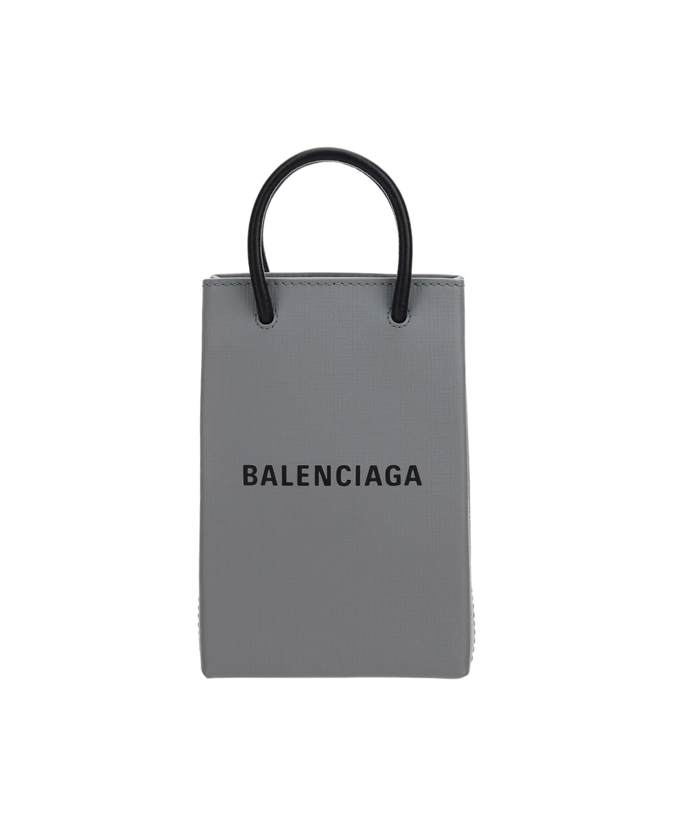 Calfskin shopping phone case by balenciaga, two rigid top handles, removable and adjustable flat leather shoulder strap, iconic contrasting brand monogram on front, interior magnetic closure, interior compartment with pocket.