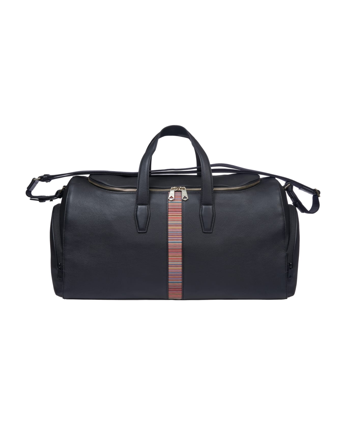 Black duffle bag with multicolor stripes. Large compartment with zip and adjustable shoulder strap and handles. Side pockets with zip and central patch pocket on the back. Composition:100% leather. Dimensions: 28 cm x 50 cm x 22 cm. Made in Thailand.