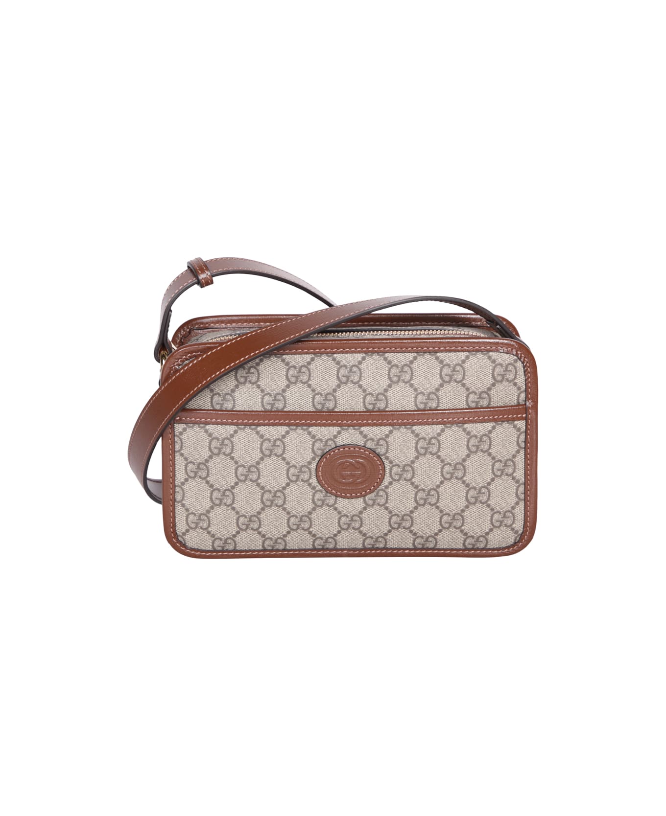Top zip fastening. Main compartment. Internal slip pocket. Front pocket. Logo patch to the front. All-over GG motif. Adjustable shoulder strap. Leather edges. Gold-tone hardware. Color: beige/ brown