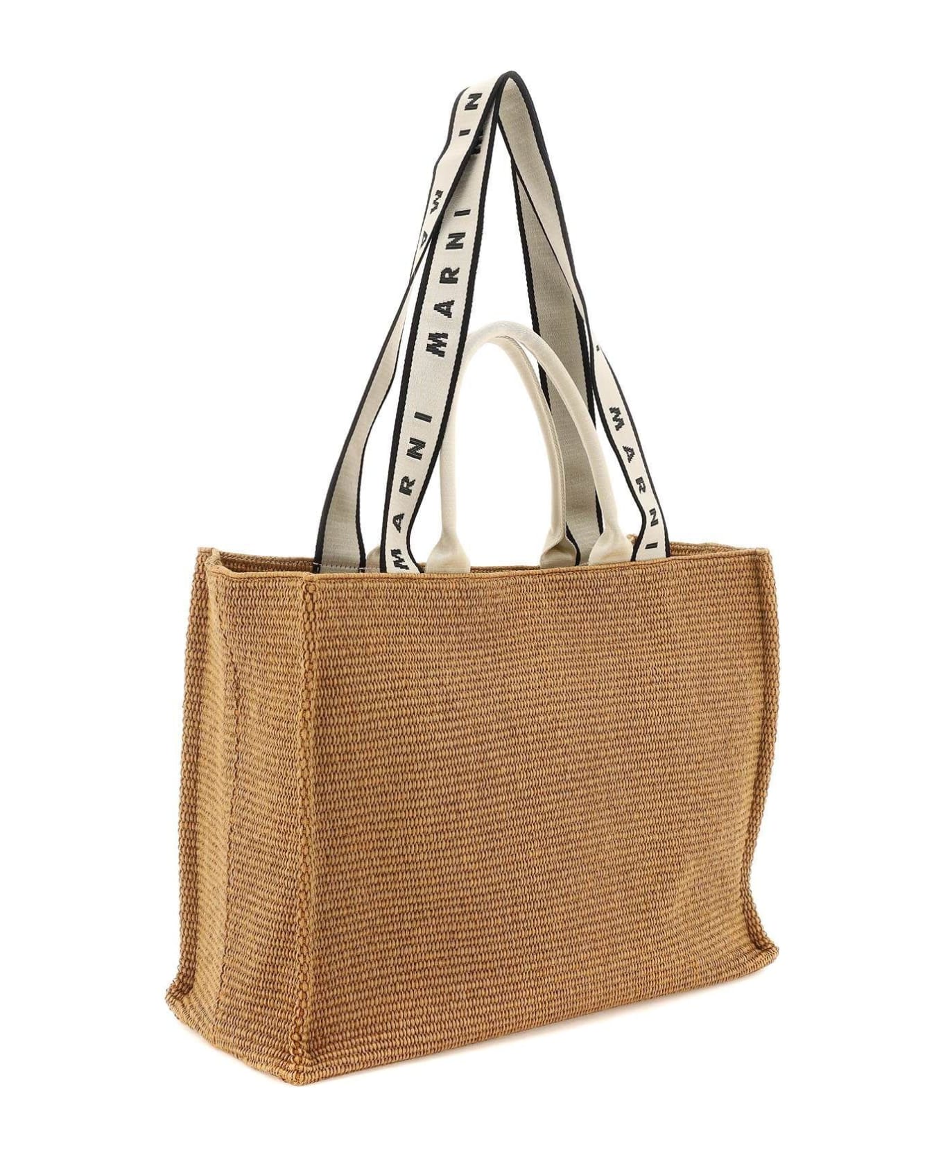 Raffia large shopping bag by Marni with double cotton ribbon handle to carry it by hand and double branded jacquard ribbon handle to carry it on the shoulder. Cotton twill lining with contrasting logo patch and one zippered flat pocket. Leather strap with pin closure. Silver-finished metalware. Composition: 52% Cotton 48% Polyamide