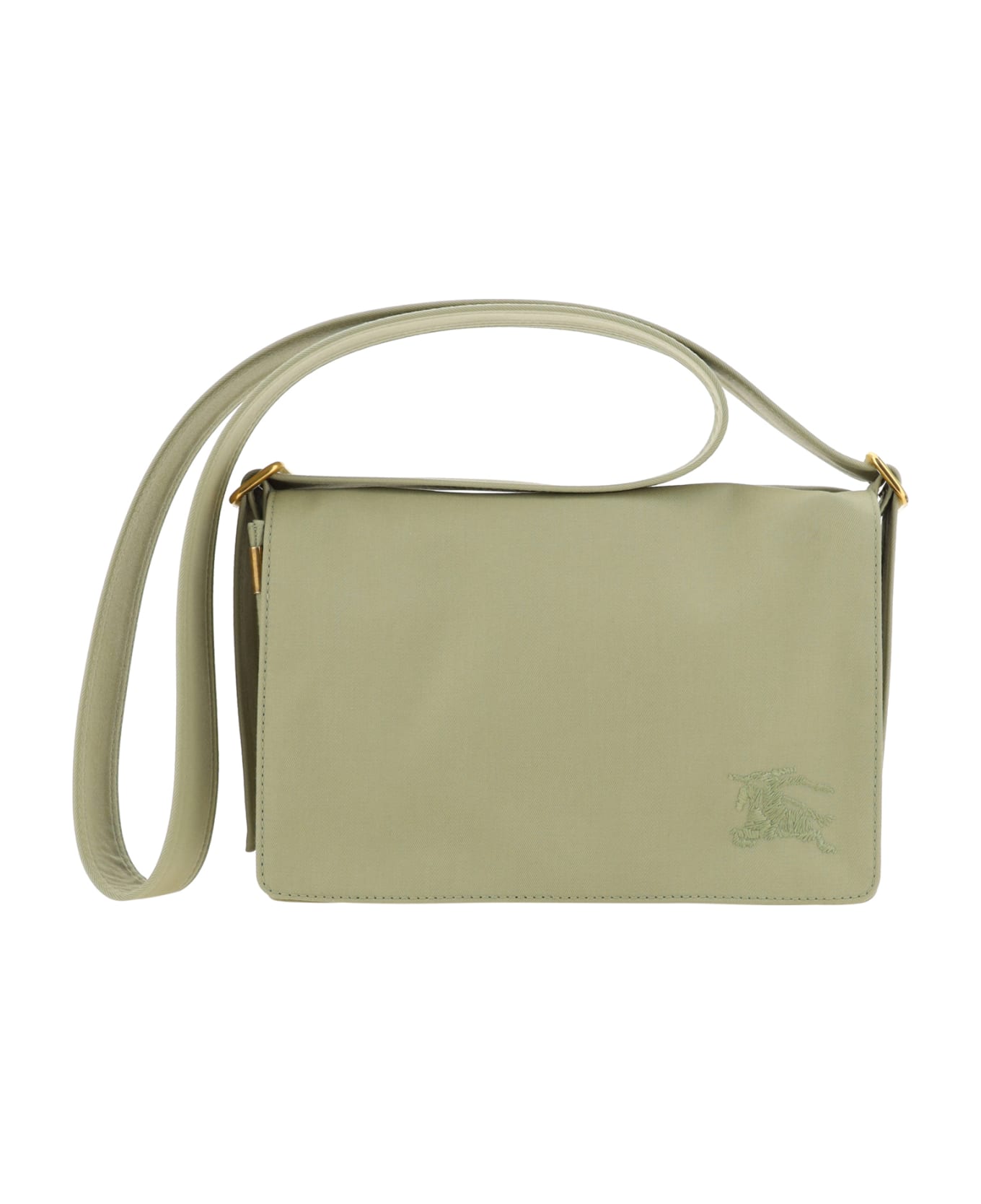 Cotton shoulder bag by burberry, adjustable shoulder strap, two main compartments, flap closure on front and back, top center slit pocket, iconic equestrian knight embroidered on front. Composition: 35% % Cotton, 65% % Polyester