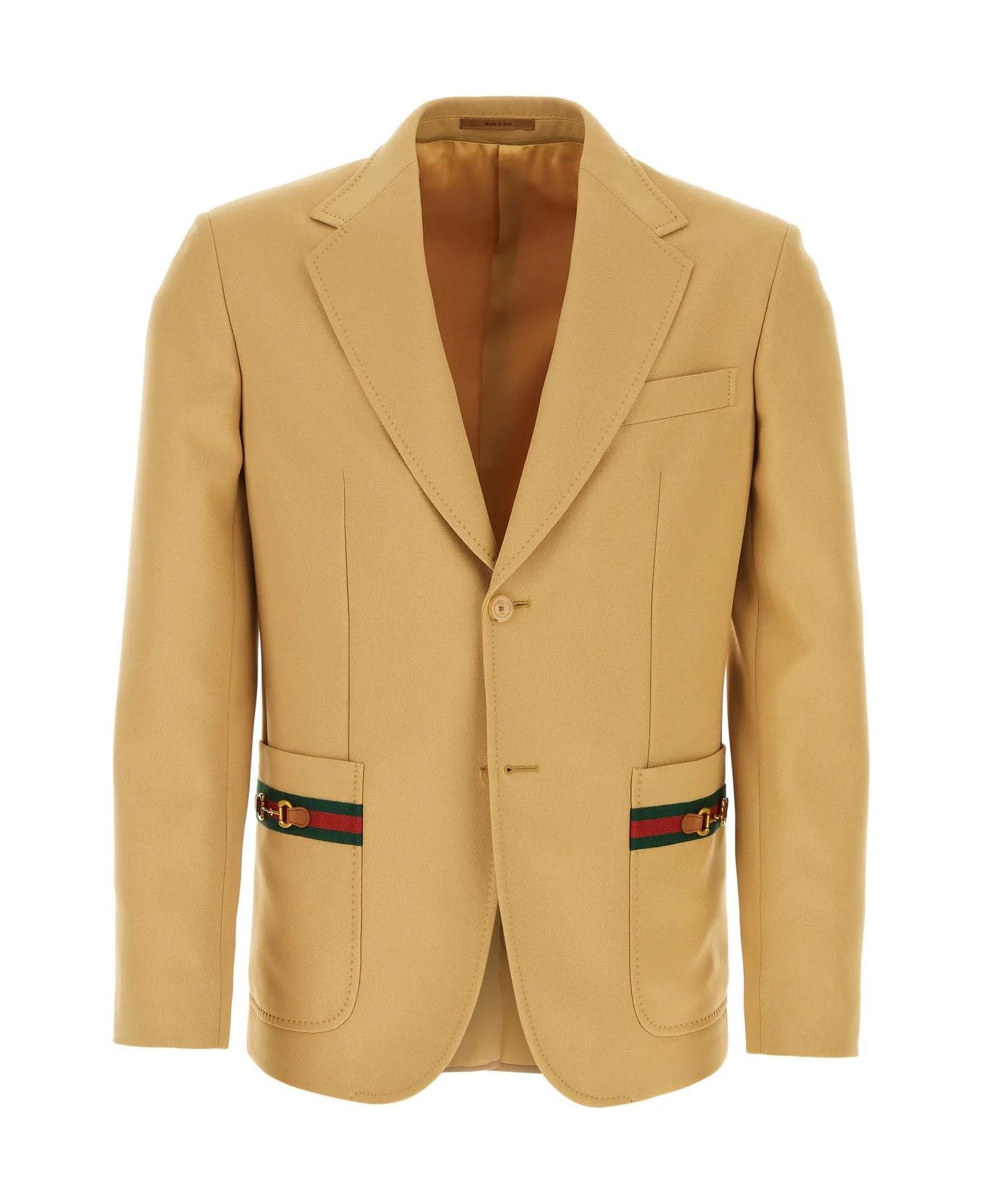 Blazer realized in polyester enriched by Web Ribbon and Horsebit details at the front. - Notch lapels - Single-breasted closure by two buttons - A chest pocket and two patch pockets at the front - Five buttons on the sleeves - Central slit at the back - Lined interior with two slit pockets Composition: Exterior: 100% Polyester Lining: 100% Viscose Composition: 100% Polyester, 50% Acrylic, 50% Wool