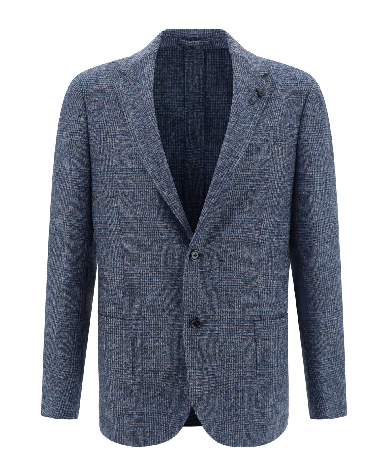 Alpaca wool blazer jacket by lardini, classic lapels embellished with the brand's iconic floral logo pin, front button closure, two slit patch pockets on front, all-over tartan pattern, regular fit.