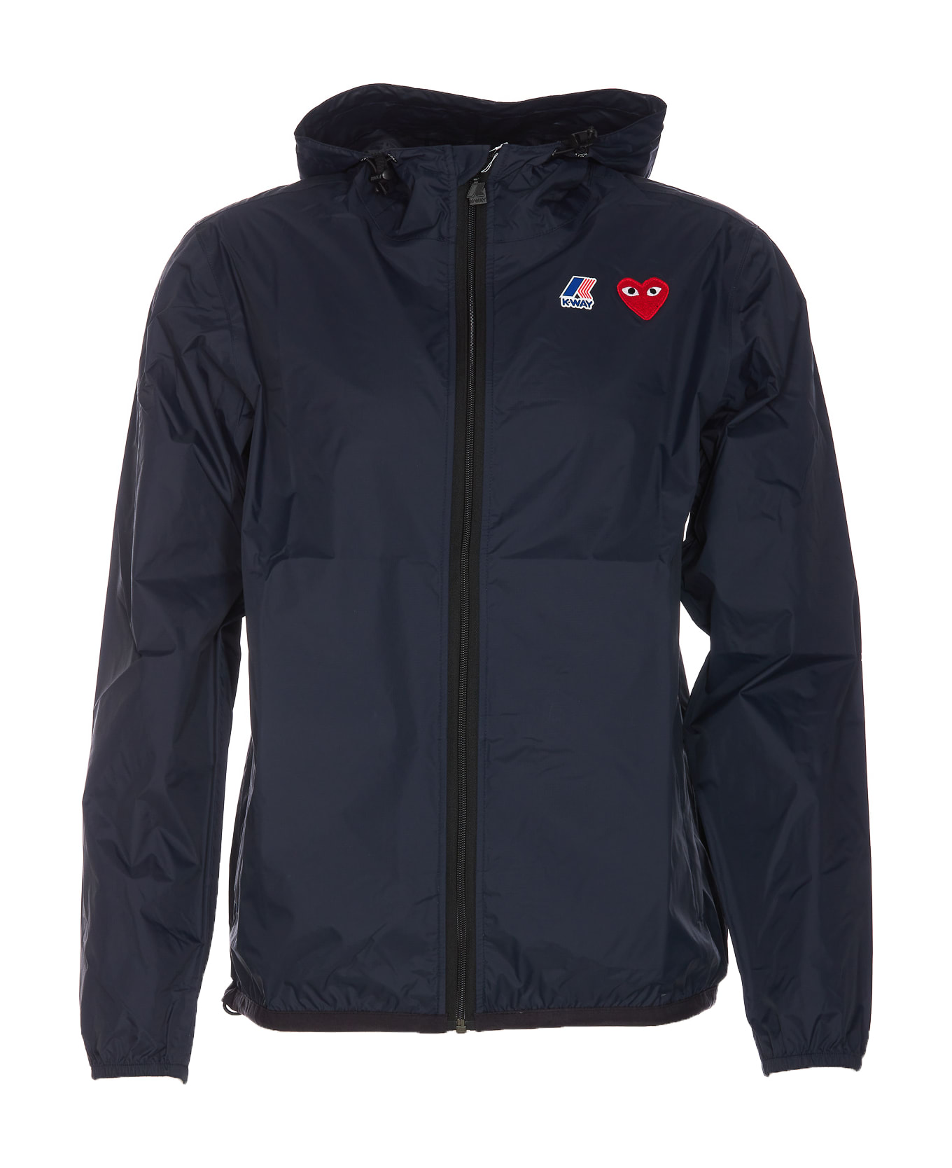 Comme Des Garcons blue CDG jacket with frontal zip closure, hood detail, heart patch logo on the front, print logo on the front, long sleeves, zip pockets