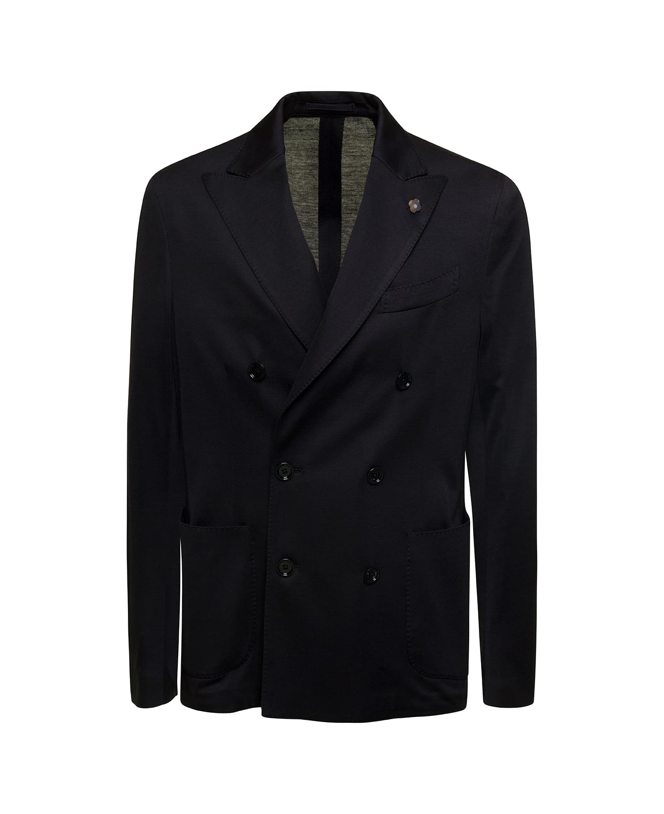Black Double-breasted Jacket With Tonal Buttons And Signature Pin In Silk And Cotton Man