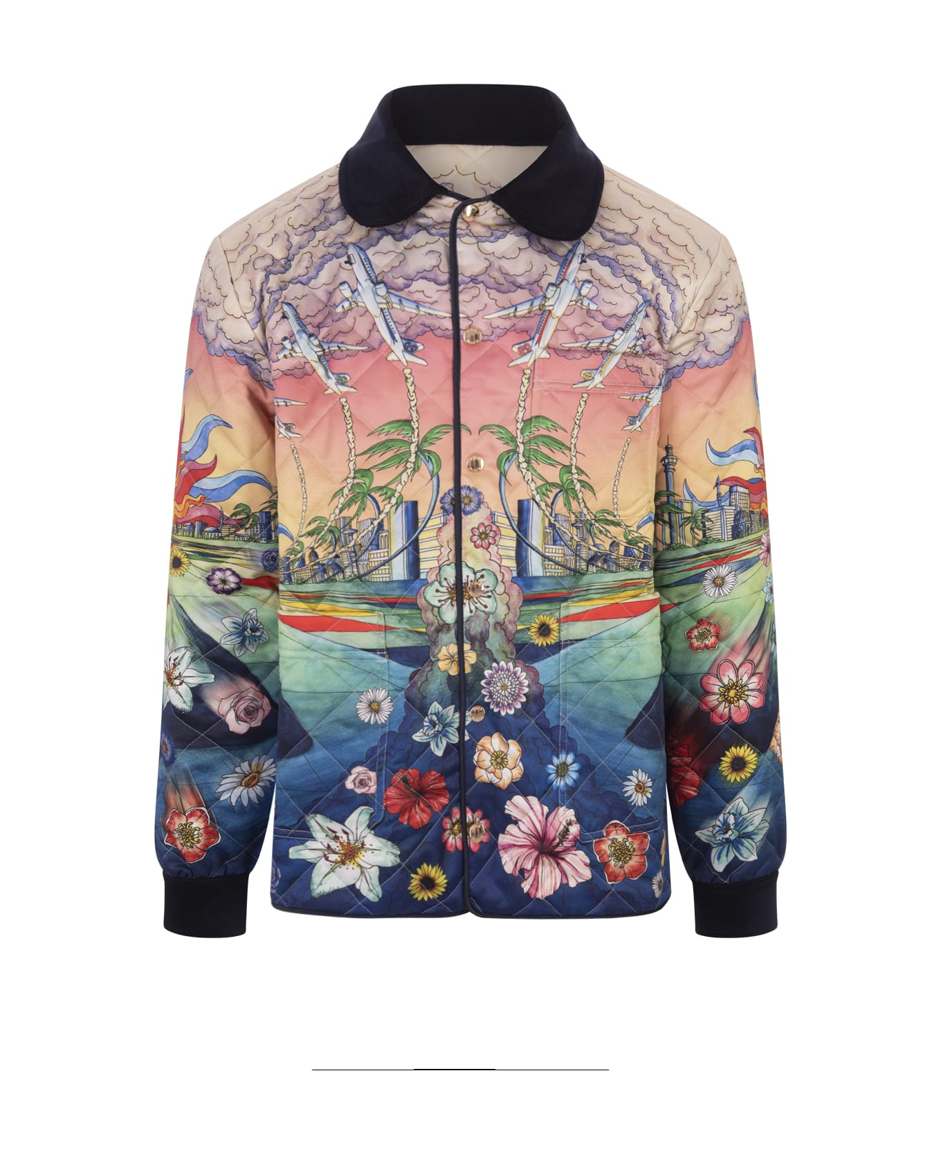 L'Envol hunting jacket by Casablanca made of quilted polyester fabric with L'Envol print. Long-sleeved design with seasonal artwork rendered in a selection of cool dark blue and warm yellow and pink tones. The garment is finished with side pockets, a contrasting black collar and cuffs, and gold hardware on the front fastening. Composition: 100% Polyester