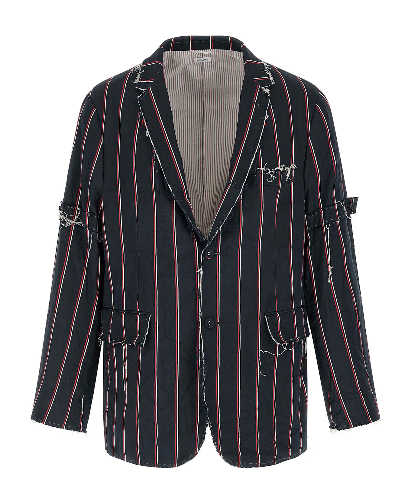 Mogador striped patterned silk and cotton blend blazer jacket with raw cut fringed hem, deconstructed single-breasted model with front button closure, breast pocket, flap pockets, cuffs with open buttonholes, back slits, striped Oxford cotton lining. Composition: 55% silk, 45% cotton