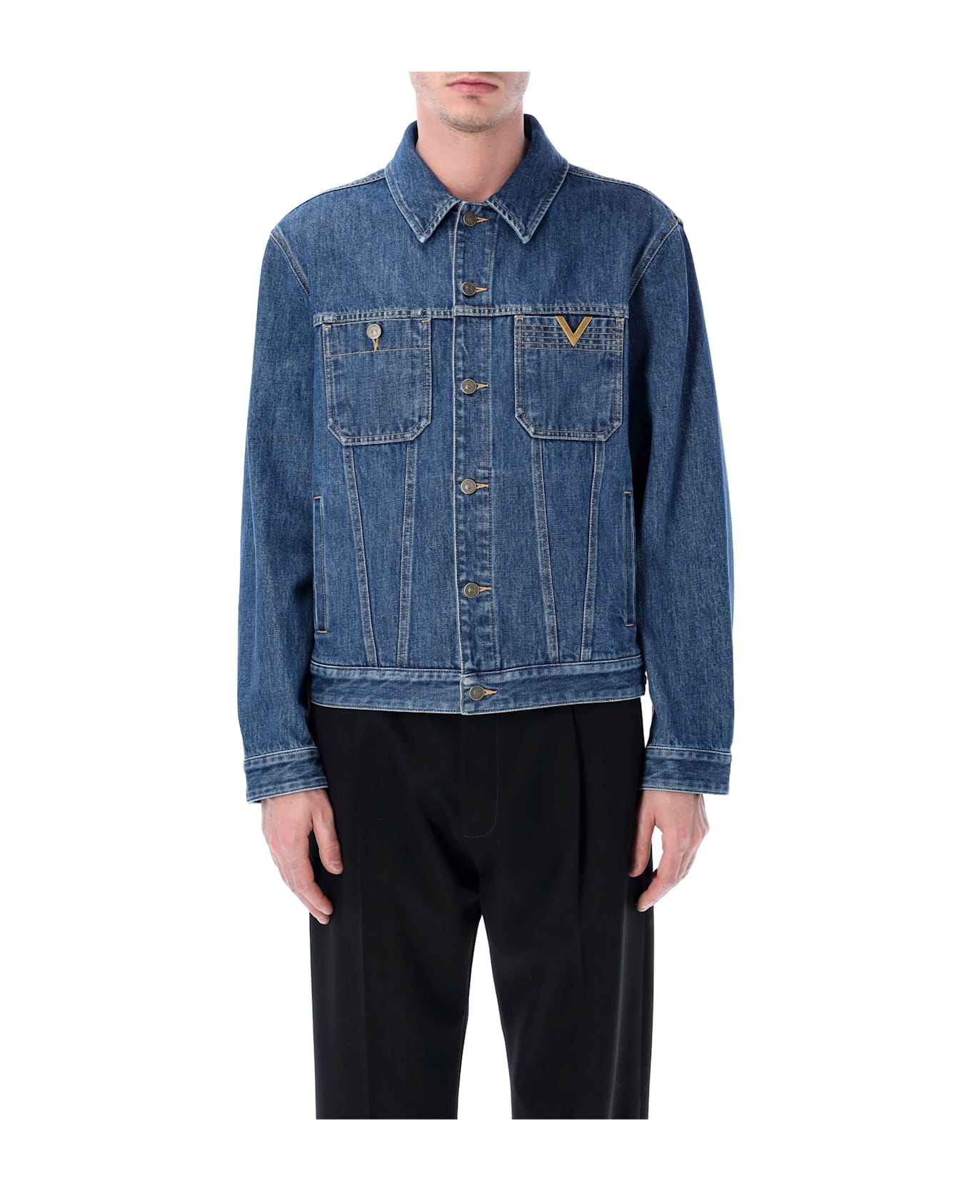 This Valentino Garavani Denim Jacket Reinterprets A Timeless Menswear Staple With A Refined, Modern Attitude. Crafted From Cotton Denim, It Features A Regular Fit And A Clean Construction Enhanced By Tailored Details. The Signature Vgold Accent On The Chest Pocket Adds A Distinctive Touch, Making The Jacket A Versatile Piece For Both Casual And Elevated Styling. Cotton Denim Jacket Vgold Detail On Chest Pocket Front Button Fastening Two Chest Pockets Regular Fit Andrea Is 1,90 M And Wears Size 50