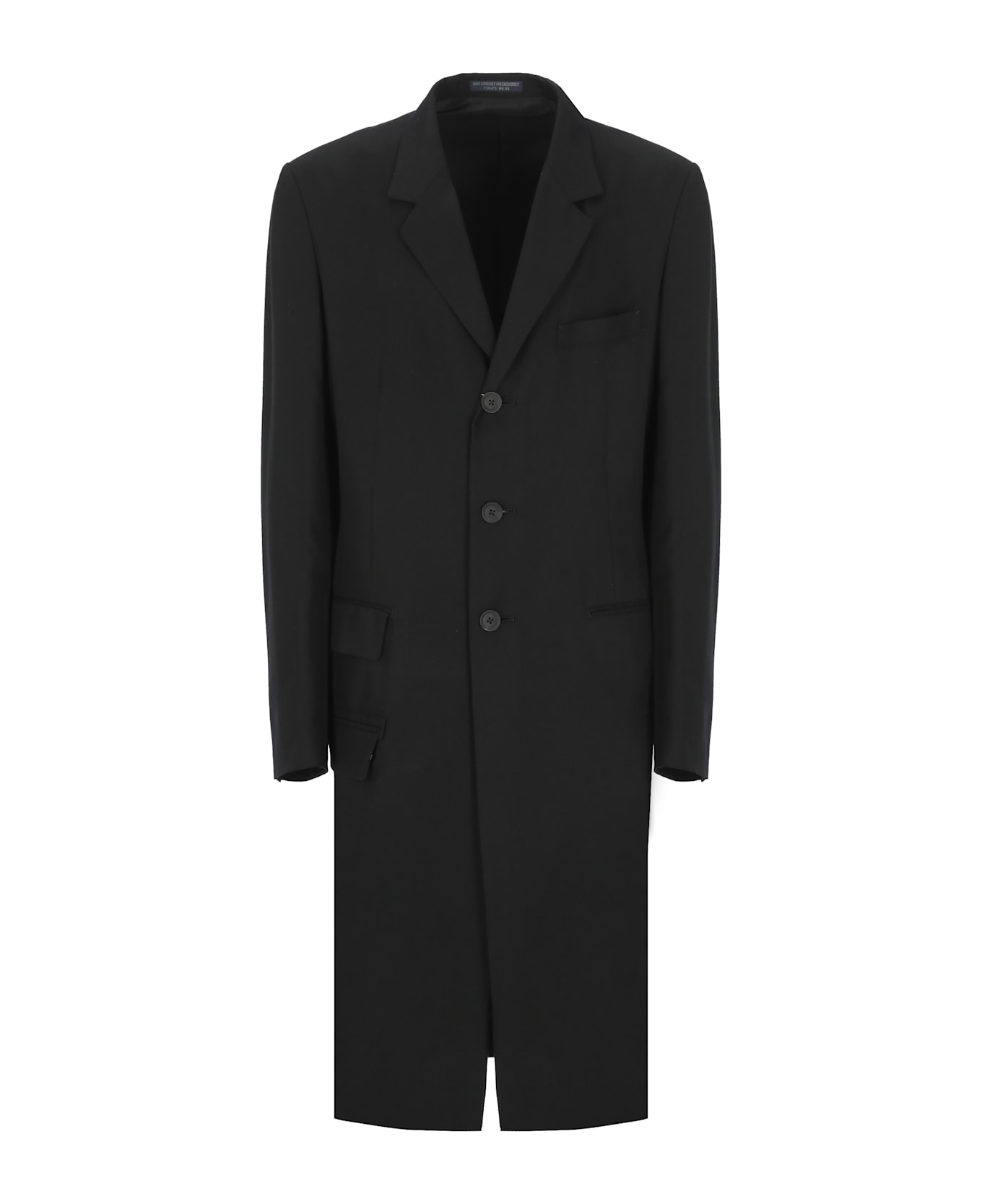 - Black Yohji Yamamoto Pour Home cellulose coat for man - Classic lapel collar - Long sleeves with buttons at hem - Chest pocket - Two front welt pockets - Front buttons fastening