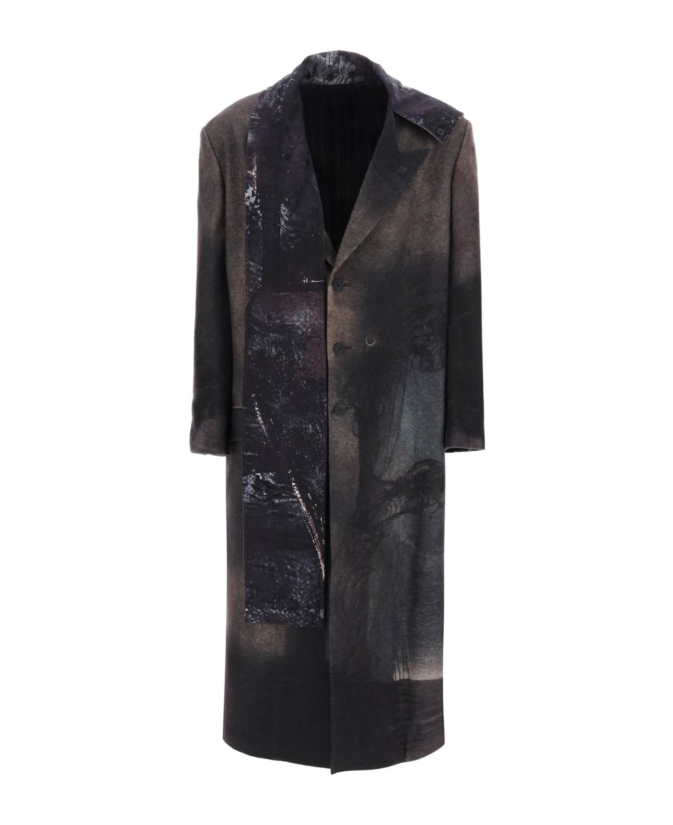 Yohji Yamamoto coat in cotton-blend felted jersey, decorated with a print inspired by the polish painter Zdzislaw Beksinski. It features single-breasted button fastening, three-button cuffs, a flap pocket and peak-lapel collar enriched by an integrated stole, lined in patterned silk satin. Striped cotton twill lining, with two inner pockets. Regular fit. The model is 187 cm tall and wears a size M.