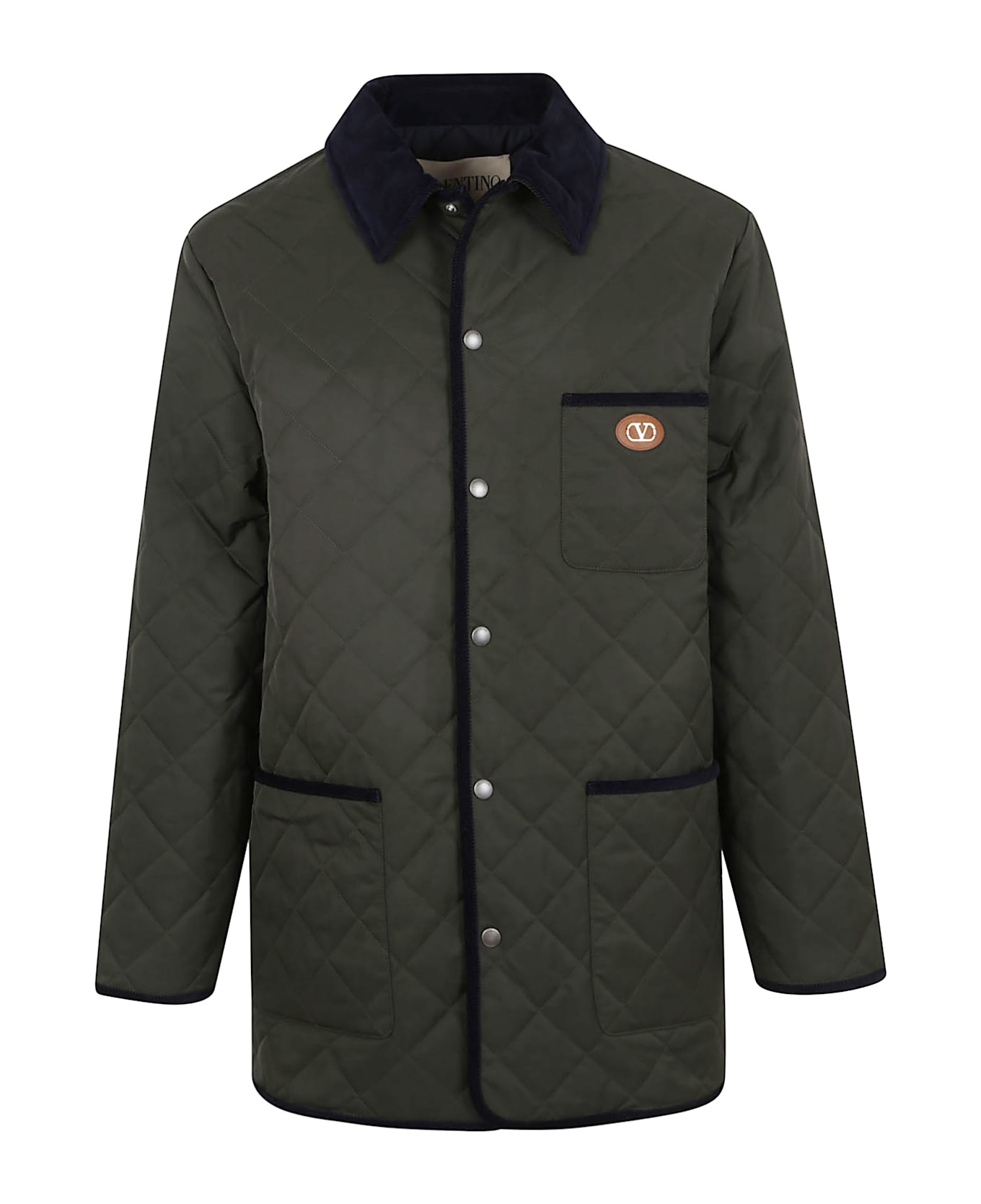 Quilted nylon shirt jacket by VALENTINO GARAVANI. Long sleeves; snap button closure; two front patch pockets; lined and lightly padded; regular fit design. Features a velvet collar and trim and a VLogo patch on the left chest pocket worn side.