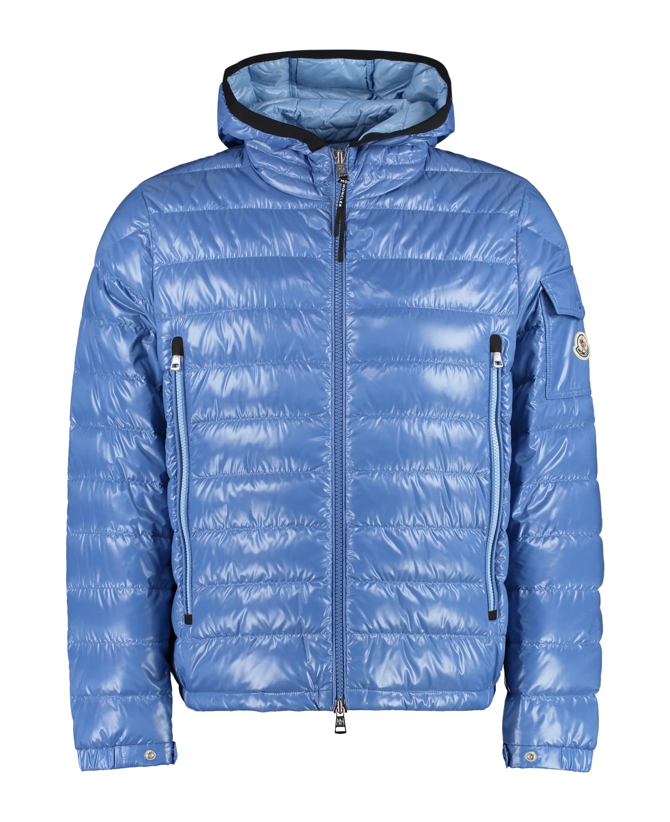 Blu Galion Hooded Short Down Jacket from Moncler Logo patch on the left sleeve