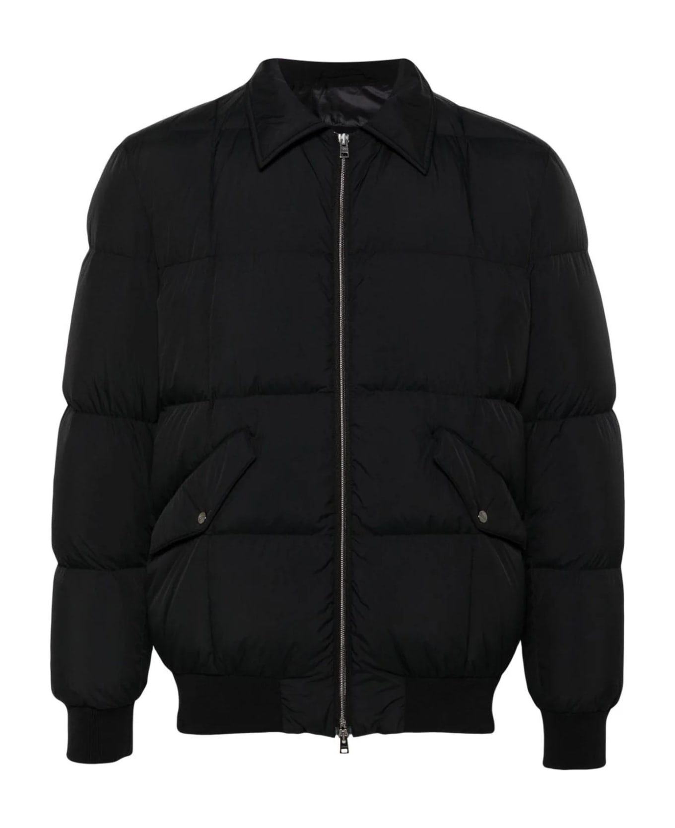 Black goose down jacket, padded design, quilted, logo plaque, classic collar, front zip fastening, long sleeves, ribbed cuffs and hem, two front flap pockets, two internal zip-fastening pockets, full lining Composition: Polyamide, 100%