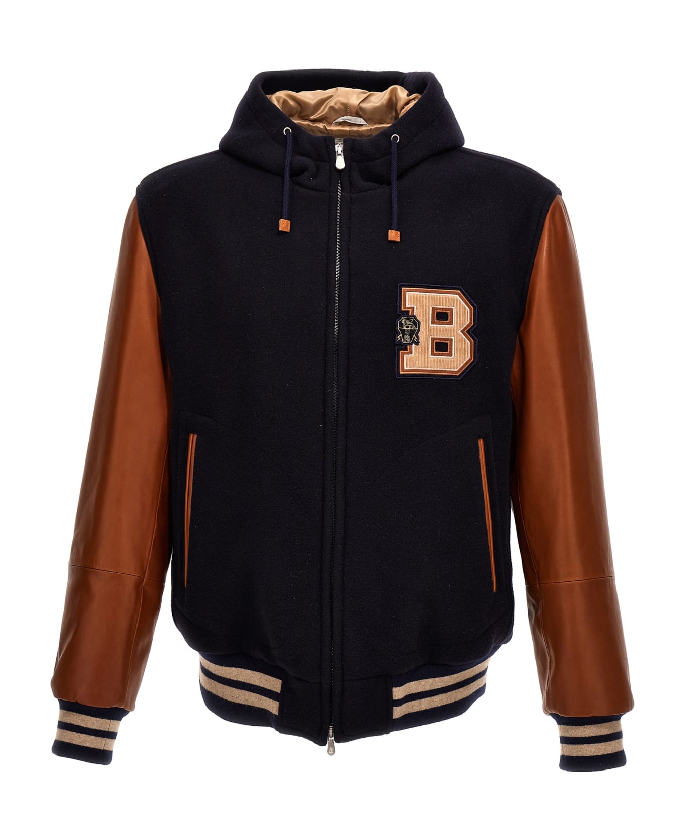 Wool cloth hooded bomber jacket, front logo patch, zip closure, pockets, long leather sleeves with knitted cuffs. Composition: 100% virgin wool
