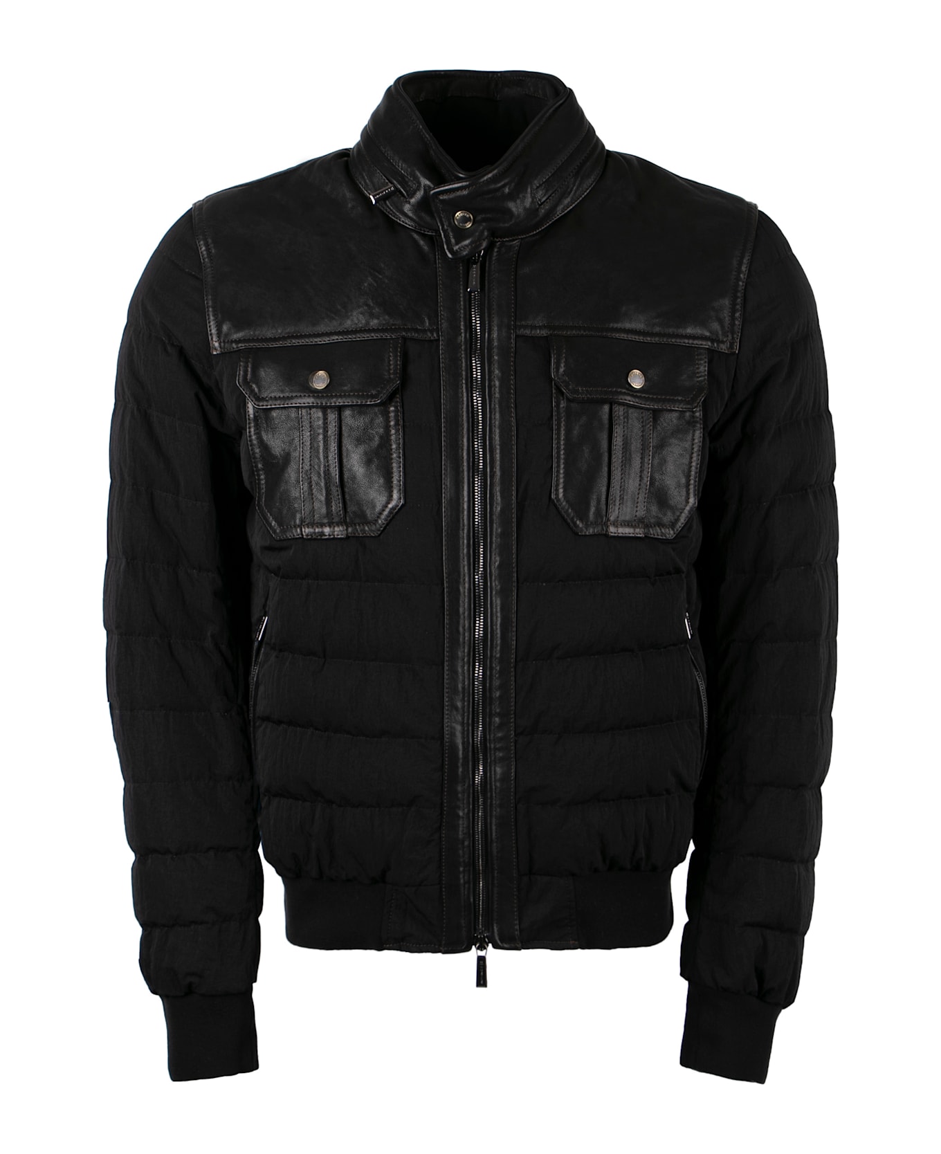 Leather inserts extractable hood two buttoned front flap pockets two side zipped pockets ribbed edges padding: 100% goose down 100% polyamide, 100% polyester, 100% leather Composition: 100% % Polyamide, 100% % Polyester, 100% % Leather