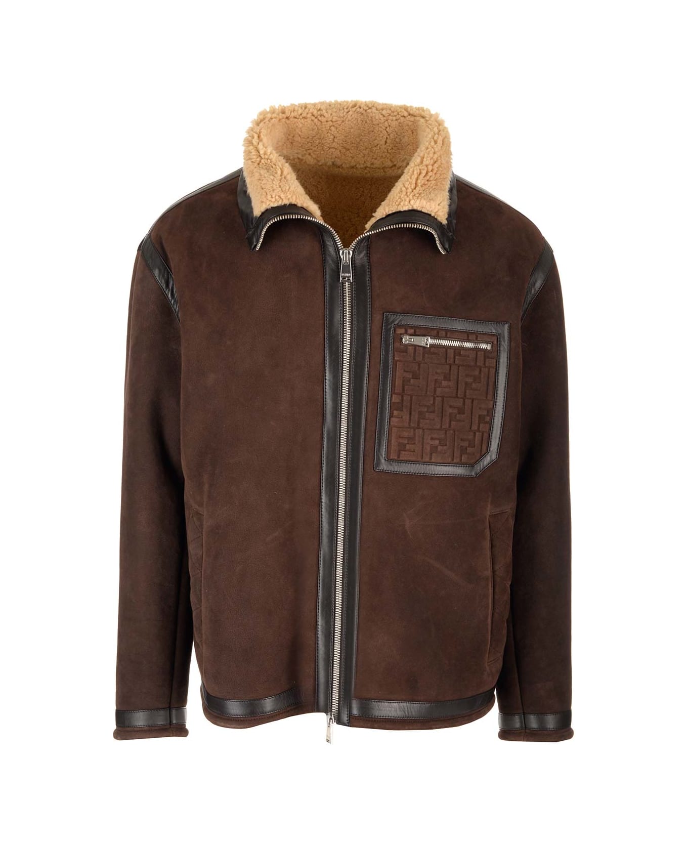 Brown shearling jacket from Fendi, unlined, slightly oversized fit with high collar, patch pocket with zip and welt pockets, adjustable hem with FF straps, zip closure and Fendi OLock slider, pocket with FF motif. Composition: 100%AGNELLO PELLE