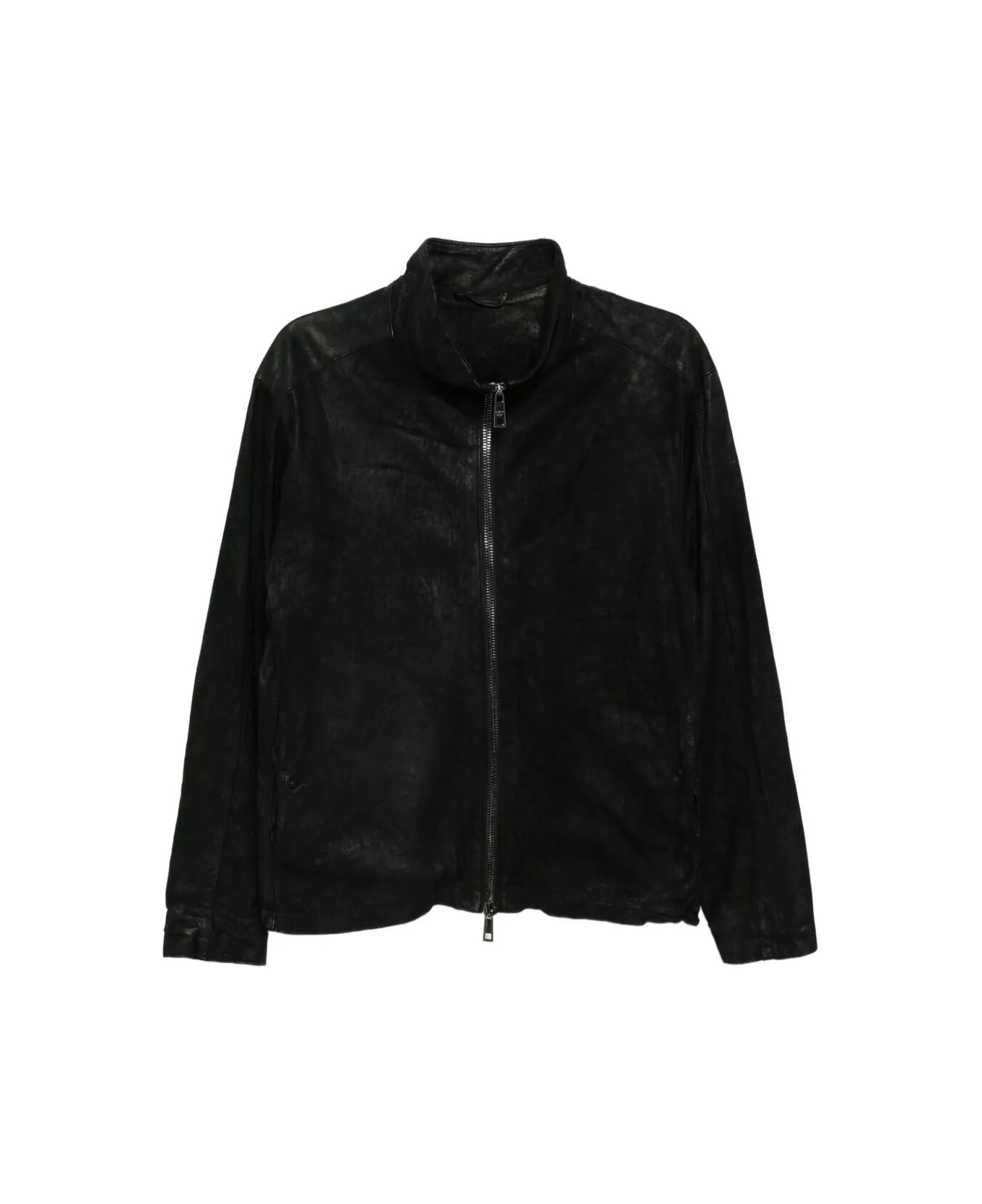 Black brushed leather jacket crafted from soft lambskin. Featuring a minimalist design with central zip and side pockets, it offers a slim fit that enhances the silhouette. Perfect for casual-chic looks, it stands out for its artisanal quality and timeless elegance.