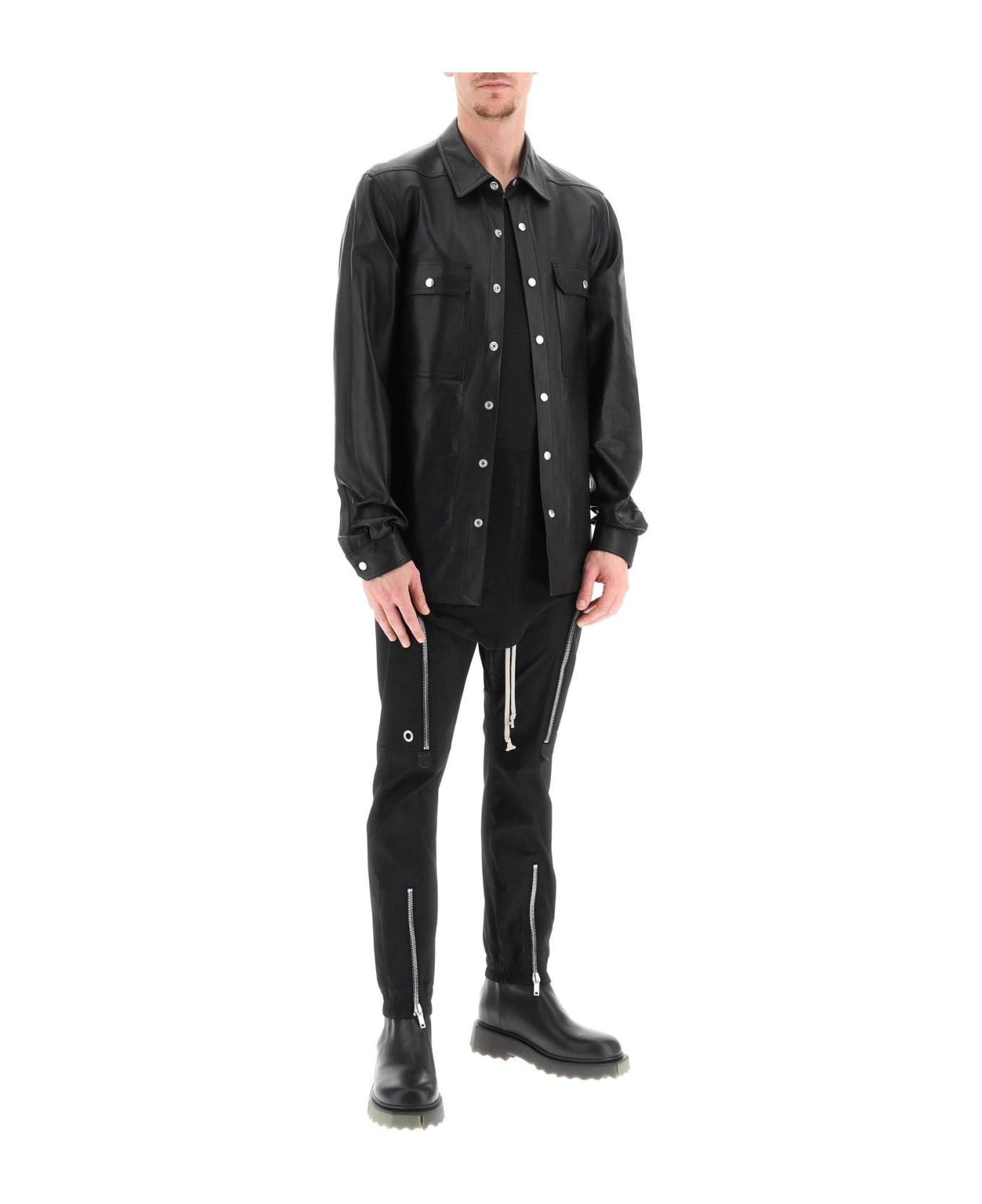 Rick Owens lambskin outershirt, featuring pointed collar, snap closure and two chest pockets with studded flap. Signature webbing tape on the back, unlined interior with two fabric pockets. Regular fit. The model is 187 cm tall and wears a size IT 48.