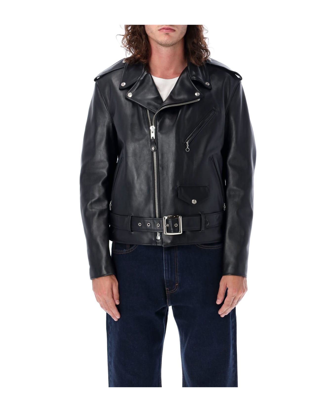 Perfecto Leather Jacket By Schott Nyc. Featuring: Asymmetrical Main Zipper Pattern Snap Down Lapels, Collar And Shoulder Epaulets Bi-swing Back Panels With Grommet Vented Underarm Footballs Traditional Zippered Sleeve Cuffs Attached Belt With Durable Nickel Plated Square Buckle With Snap Three Outside Zippered Pockets Small Coin Flap Pocket Inside Lower Map Pocket And Leather Trimmed Inside Breast Pocket Model Is 1,90 M Tall And He Is Wearing Size 42