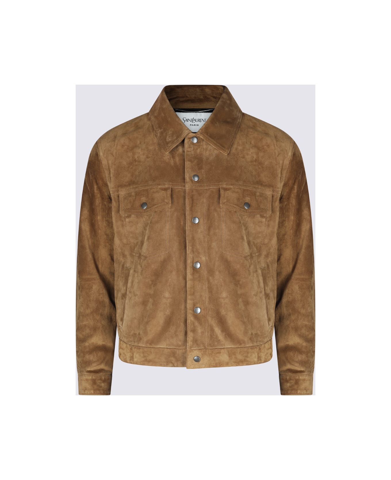 Tobacco suede jacket from Saint Laurent featuring long sleeves, clap button closure, shirt collar, regular fit and front pockets. Composition: _, 100% Le