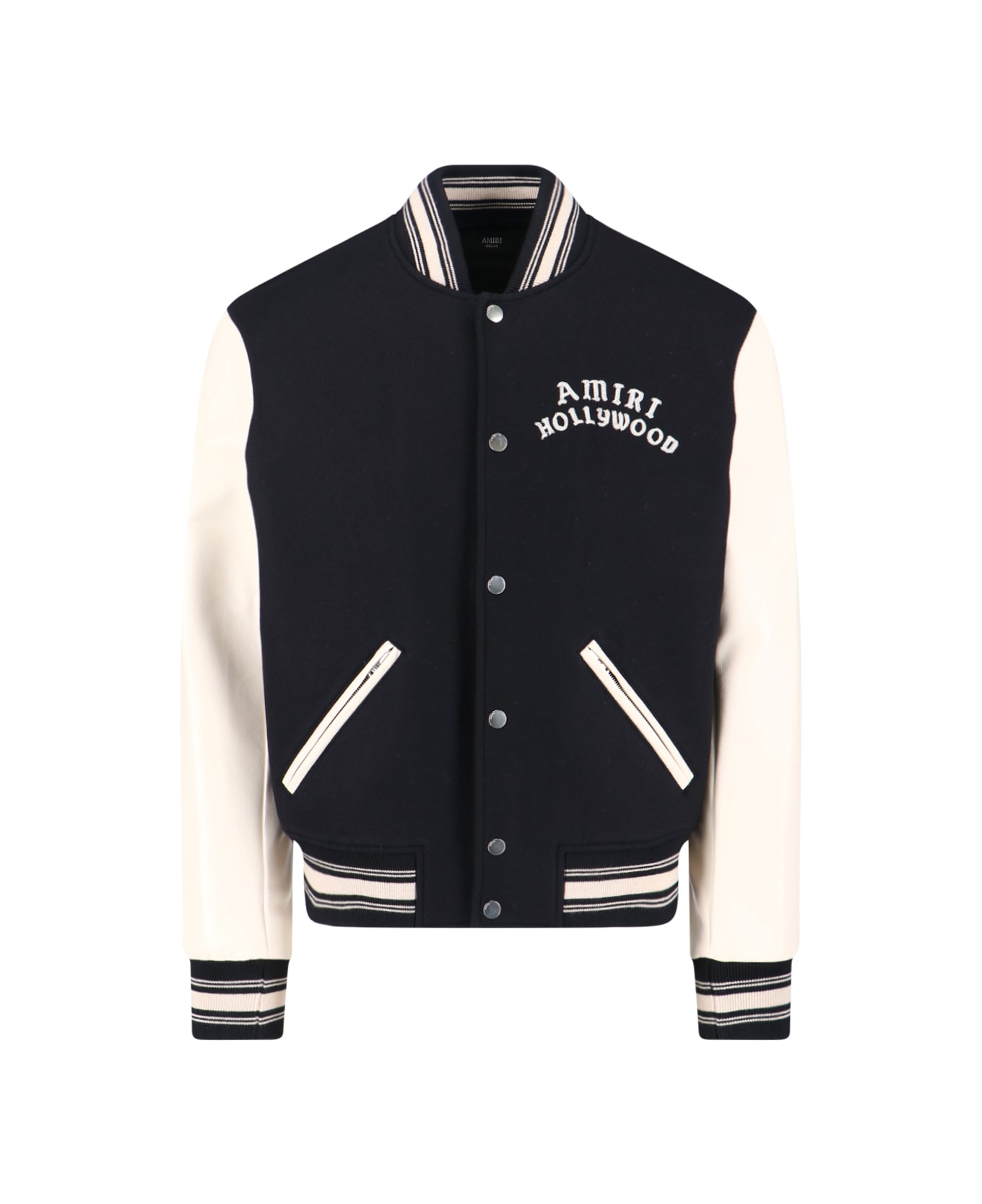 Amiri logo bomber jacket in black wool blend with contrasting details, shawl collar, ribbed trim, button closure, white logo embroidery on the chest, two side zip pockets, contrasting maxi logo at the back, elasticated cuffs and waist, and straight hem.