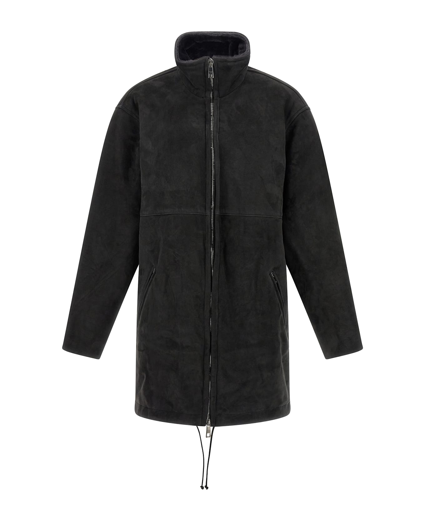 Long suede sheepskin jacket with shearling lining, high neck, front zip closure, pockets, long sleeves with raw cut hem and drawstring at the hem.