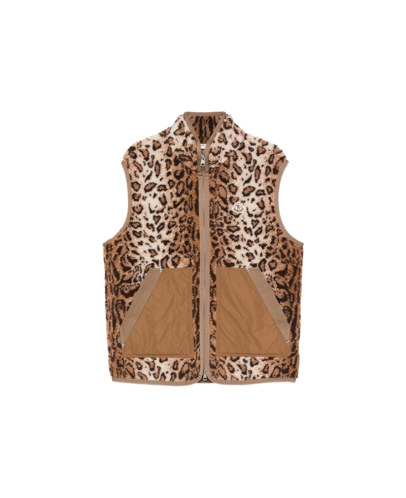 light brown animal print chest logo patch zip fastening two front pockets sleeveless