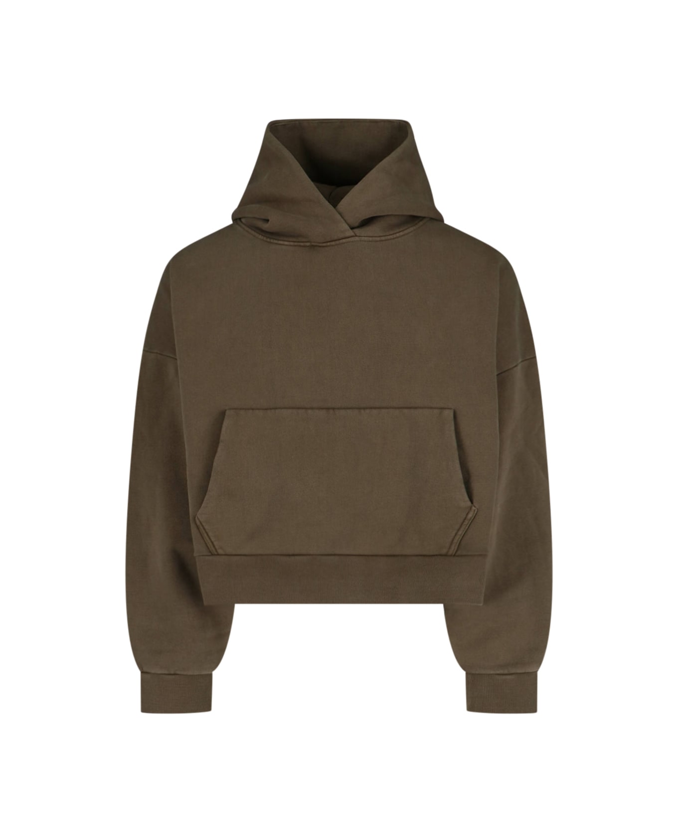 Entire Studios classic green cotton hoodie with maxi front pocket, ribbed trim, and straight hem.
