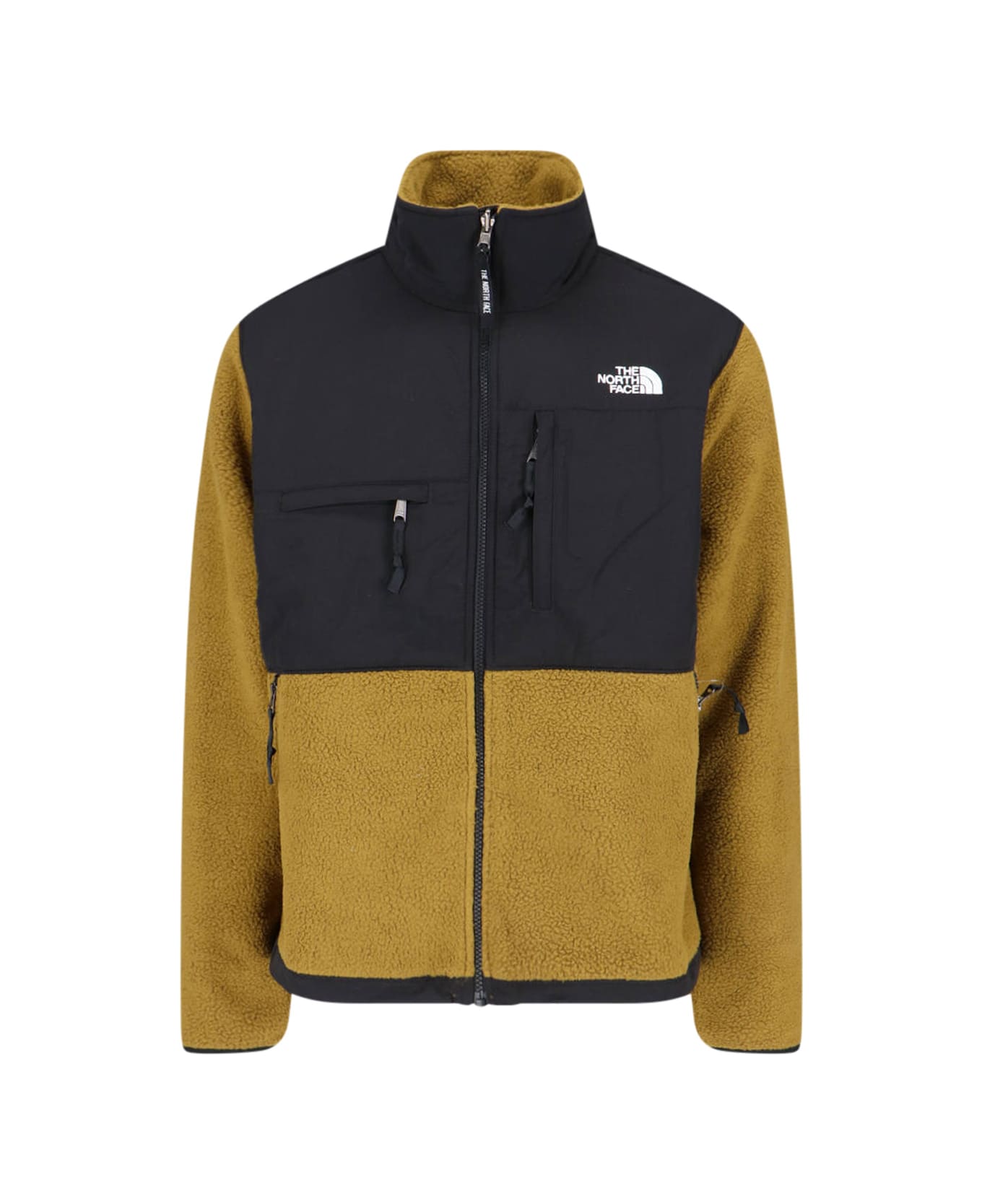 The North Face 'Denali' teddy sweatshirt in green fabric with black details, high neck, zip closure, white logo embroidery on the front and back, four front zip pockets, button cuffs, straight hem.