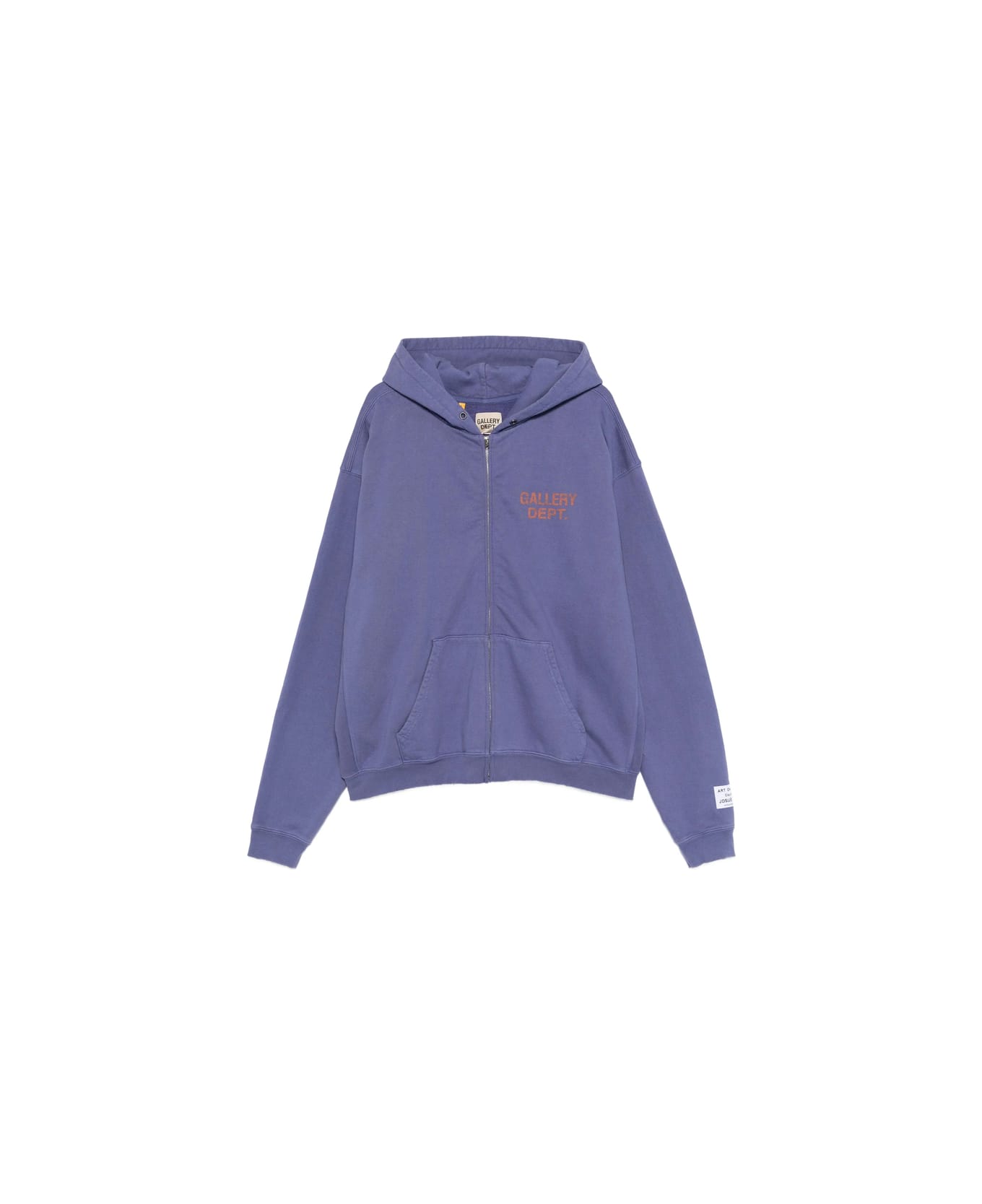 violet purple front pouch pocket front zip fastening slouchy hood logo print ribbed hem