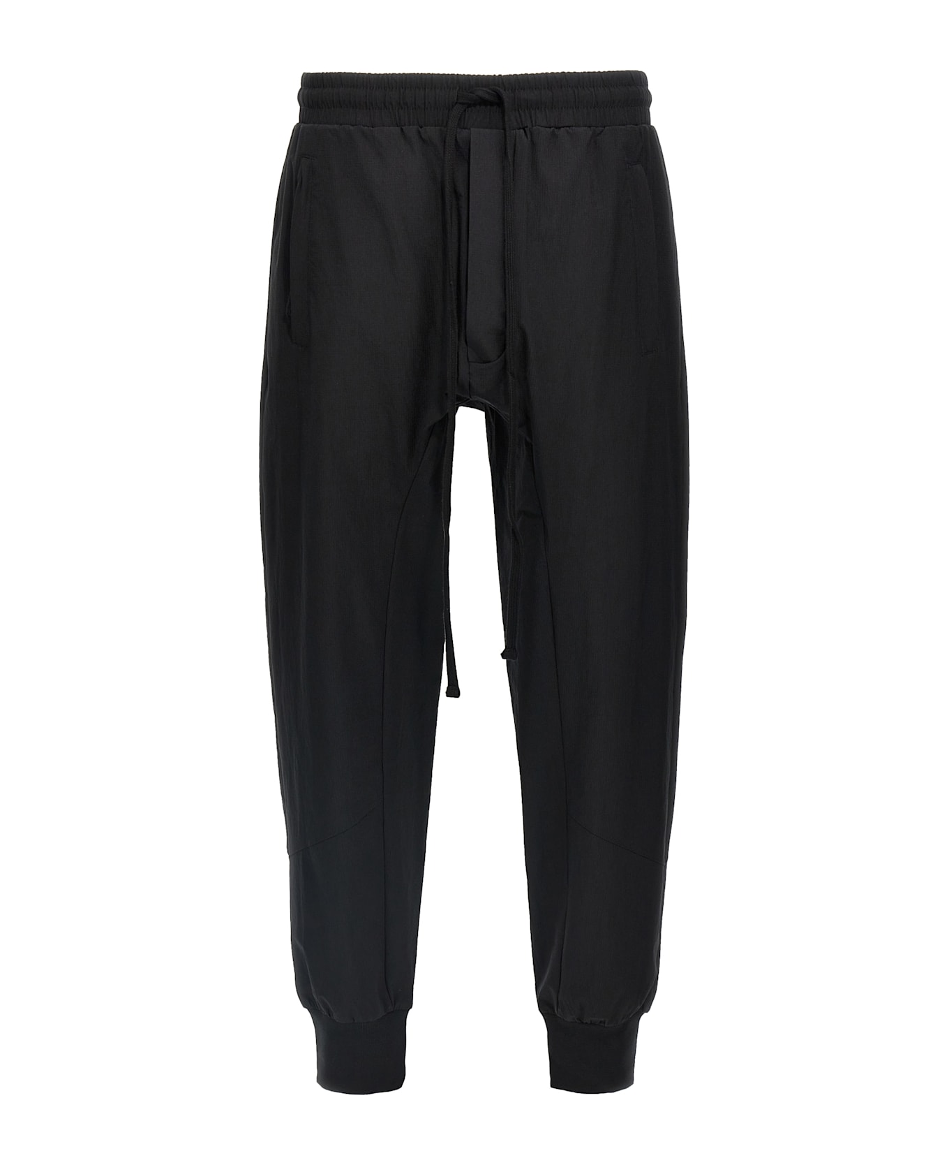 'M ST 493' stretch ripstop nylon joggers with low crotch, adjustable drawstring elastic at the waist, pockets, elastic cuffs on the leg bottom. Composition: 92% nylon, 8% elastane