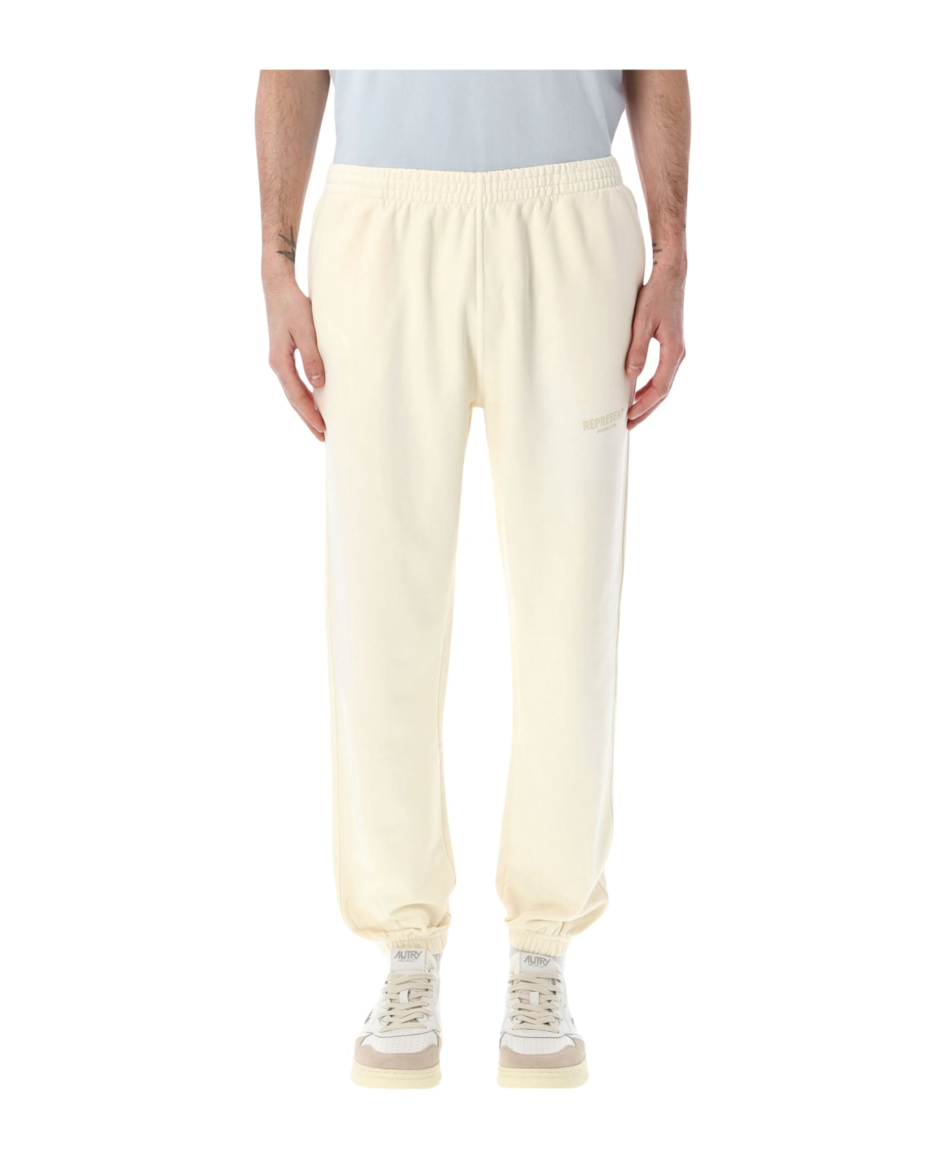 The Owners Club Cotton Jogger Sweatpants From Represent Combine Everyday Comfort With A Clean Contemporary Aesthetic. Crafted From Heavy Loopback Cotton, They Feature A Relaxed Silhouette With An Elasticated Waistband And Cuffed Ankles For A Refined Athletic Look. The Buttercream Shade And Owners Club Logo Print On The Leg Add A Distinctive Finishing Touch. Heavy Loopback Cotton Elasticated Waistband With Internal Drawstring Elasticated Ankle Cuffs Two Side Pockets Rear Patch Pocket Represent Owners Club Print On The Leg Relaxed Fit Andrea Is 1,90 M And Wears Size Xl