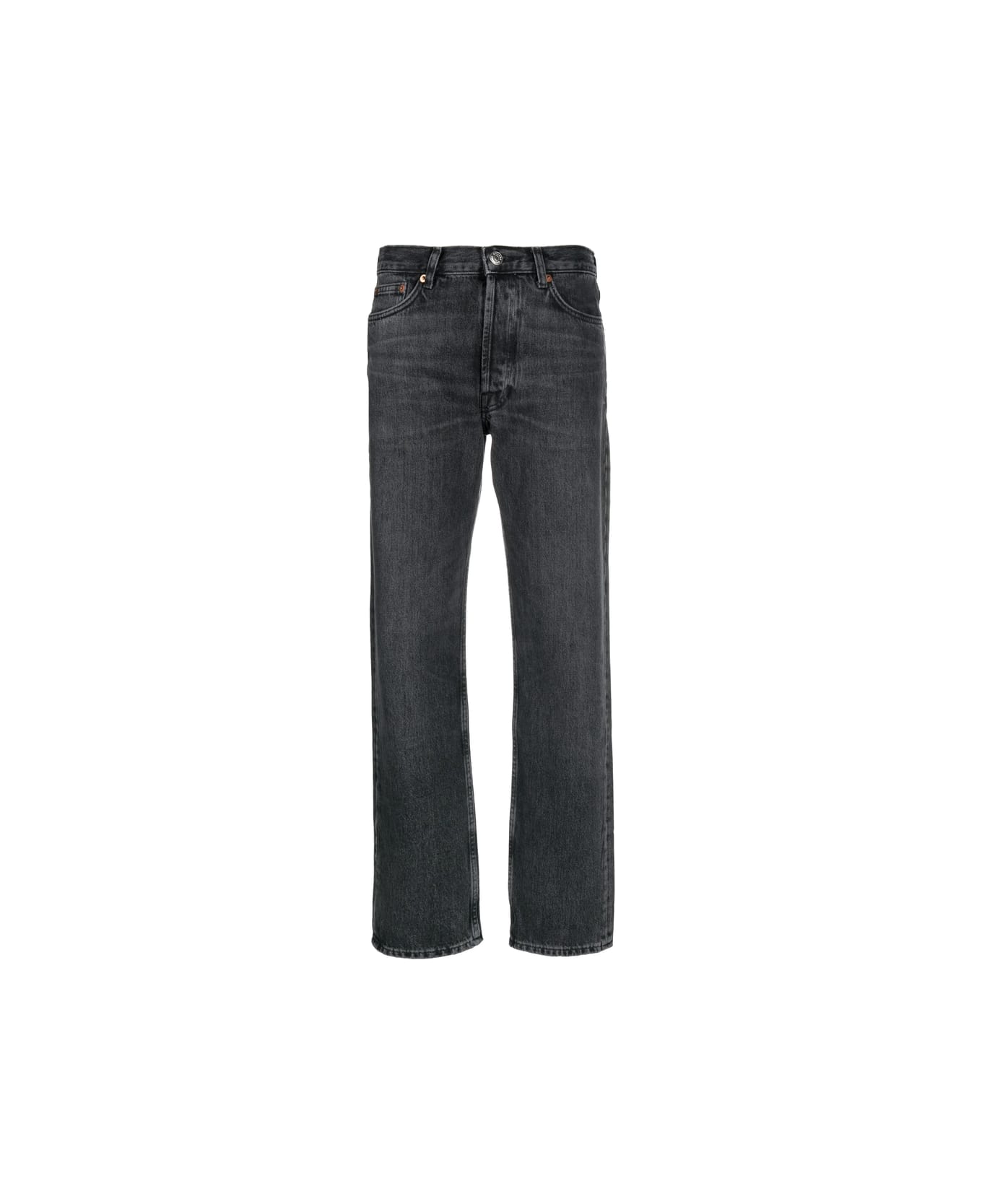 black organic cotton blend logo patch to the rear straight leg belt loops front button fastening classic five pockets