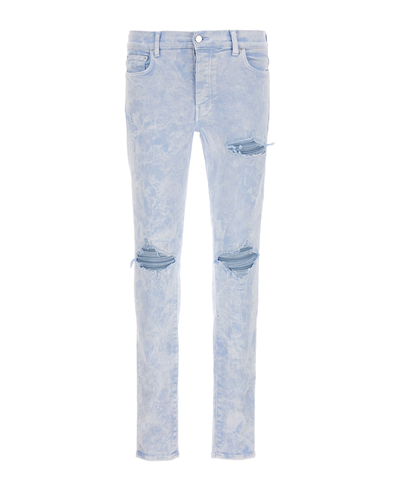 'Mineral Wash MX1 cotton blend denim jeans with a button closure, five pockets, used and destroyed details, visible patches in matching tones, and a leather logo tag.