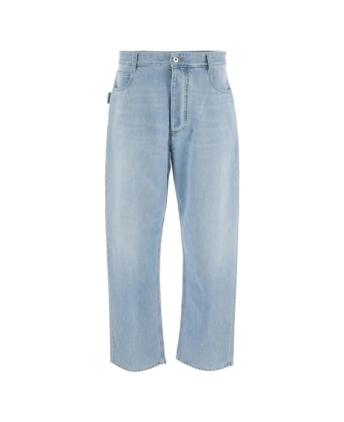 Bottega Veneta jeans in light blue cotton with belt loops. The item is featured by side pockets, buttons closure and rear logo patch.