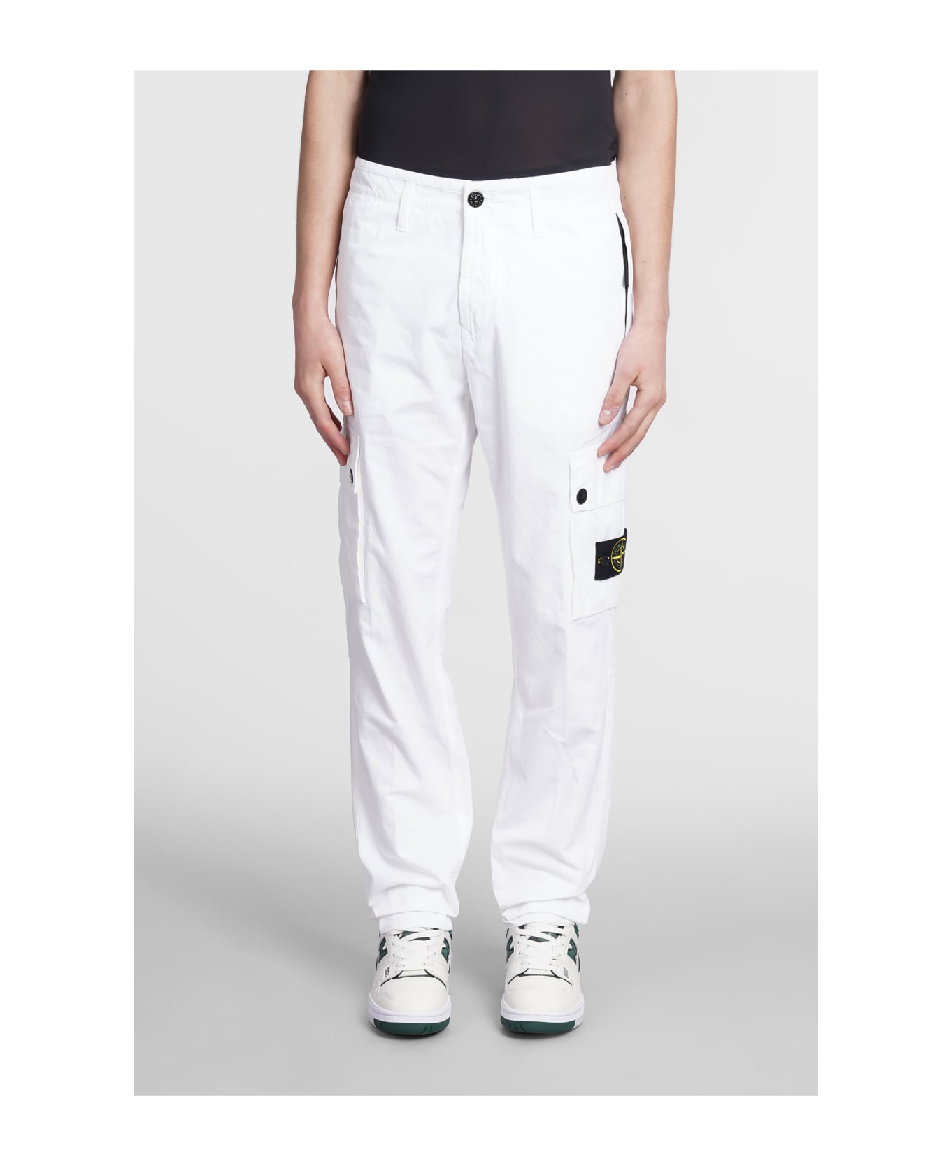 Pants in white cotton, button and zip closure, cargo pockets, side patch logo, 100% cotton, Made in Tunisia, Model is 1. 83 and wears size 31