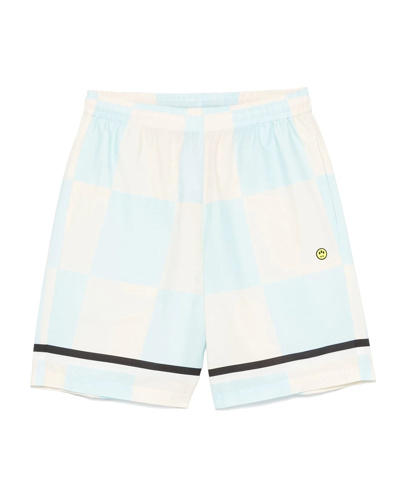 Light beige check-pattern shorts, elasticated waistband with internal drawstring, two side slit pockets, logo patch to the front