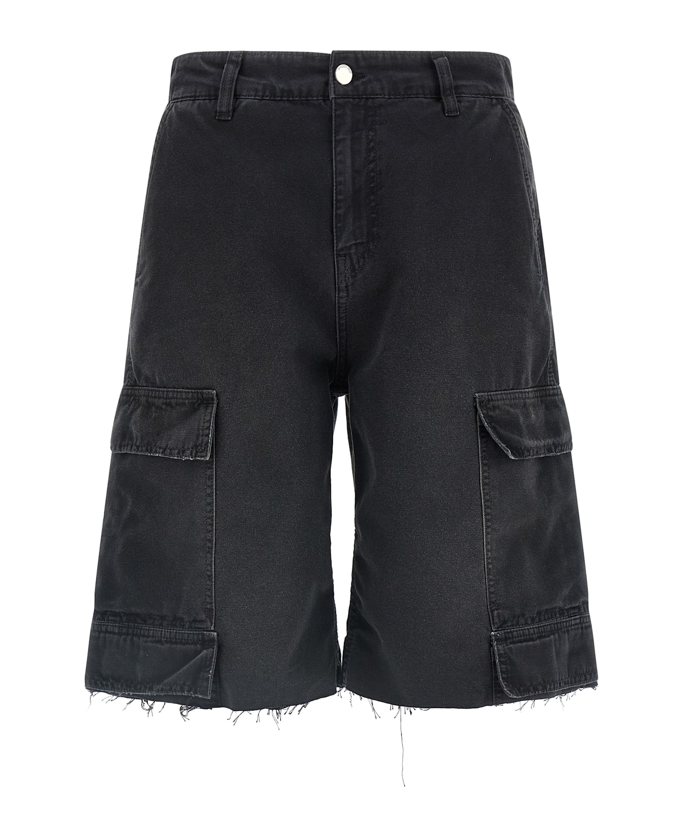 'Cargo Short ()' cargo bermuda shorts in used-effect garment-dyed cotton denim with side pockets, wide leg, front zip and button closure, back logo print, pockets, and frayed raw cut hem.