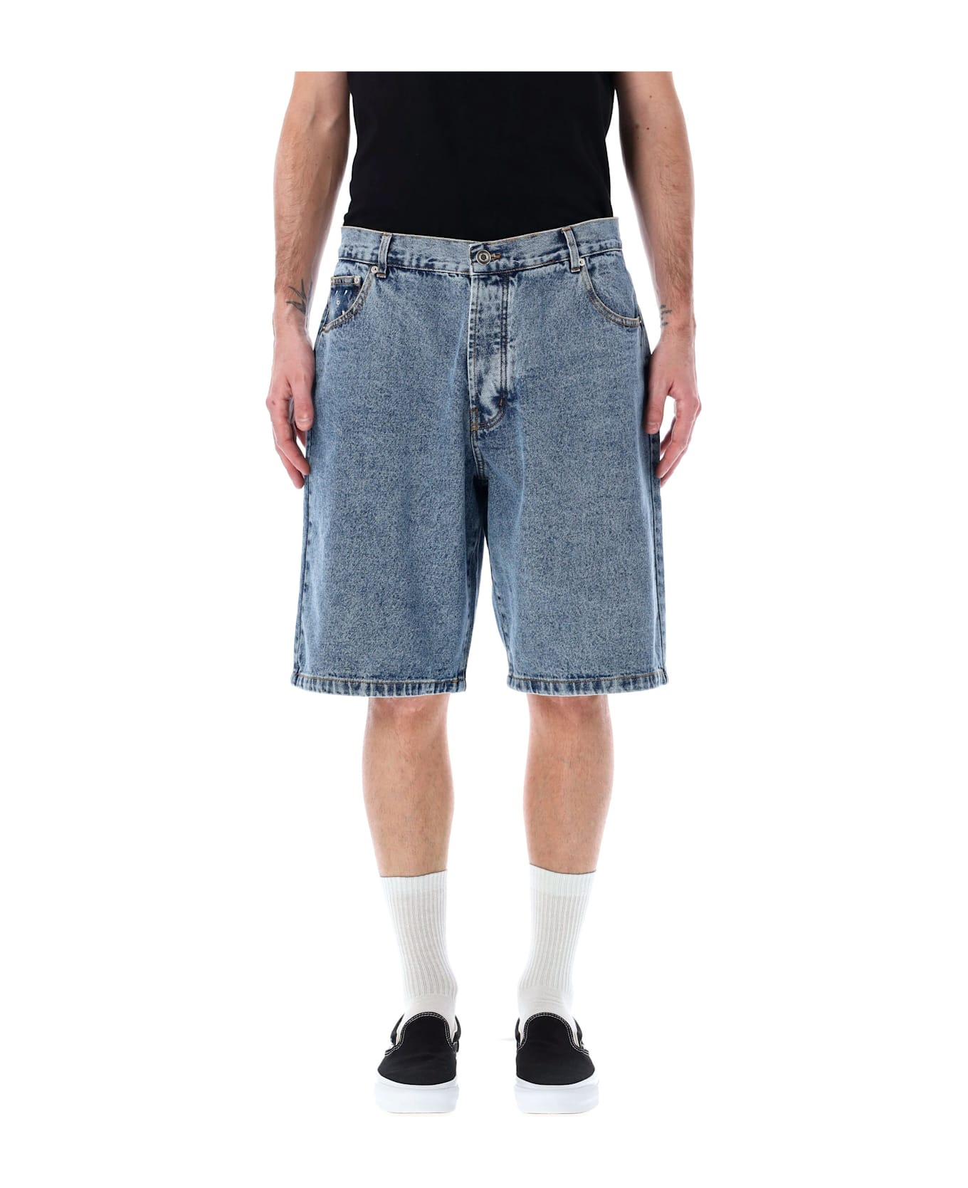 Drs Denim Shorts By Pop Trading Company. Featuring: Stonewashed Denim Button Closure Belt Loops 5 Pockets Pop Logo Embroidered On Coin Pocket Navy Pop Label Detail On Back Pocket Leather Pop Jeans Patch On Back Waist Straight Loose Fit Model Is 1,90 M And Wears Size L