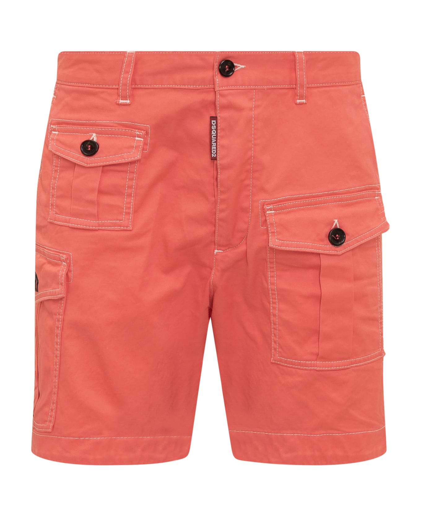Coral shorts. Button closure. Belt loops. Seven pockets.