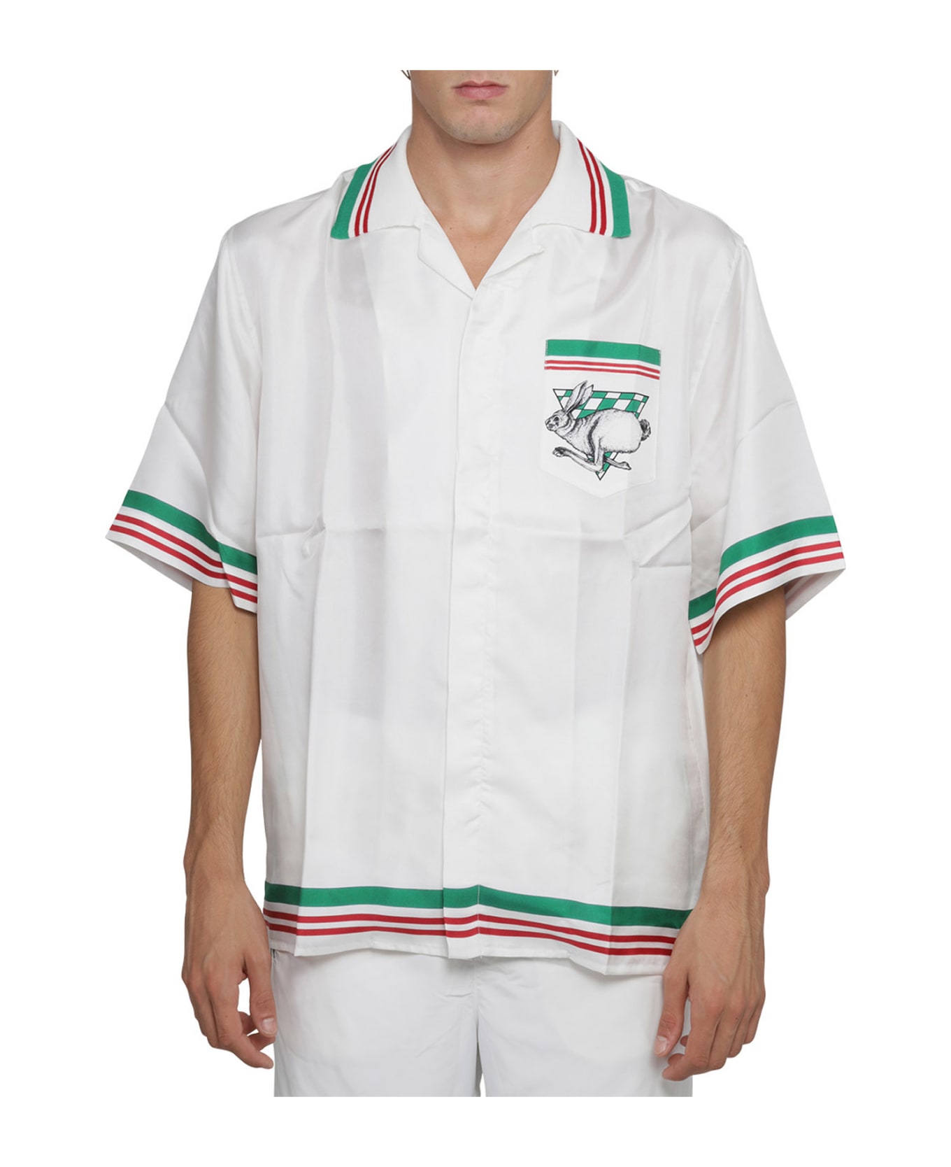 White shirt in printed silk twill. Red and green Casa Sport and Rabbit print on patch pocket and at back. White, green and red cotton knit point collar. Short sleeves. Concealed button fastening. Straight hem. Contrasting red and green outlines. 100% silk 100% cotton Made in Italy Designer colour: CASA SPORT