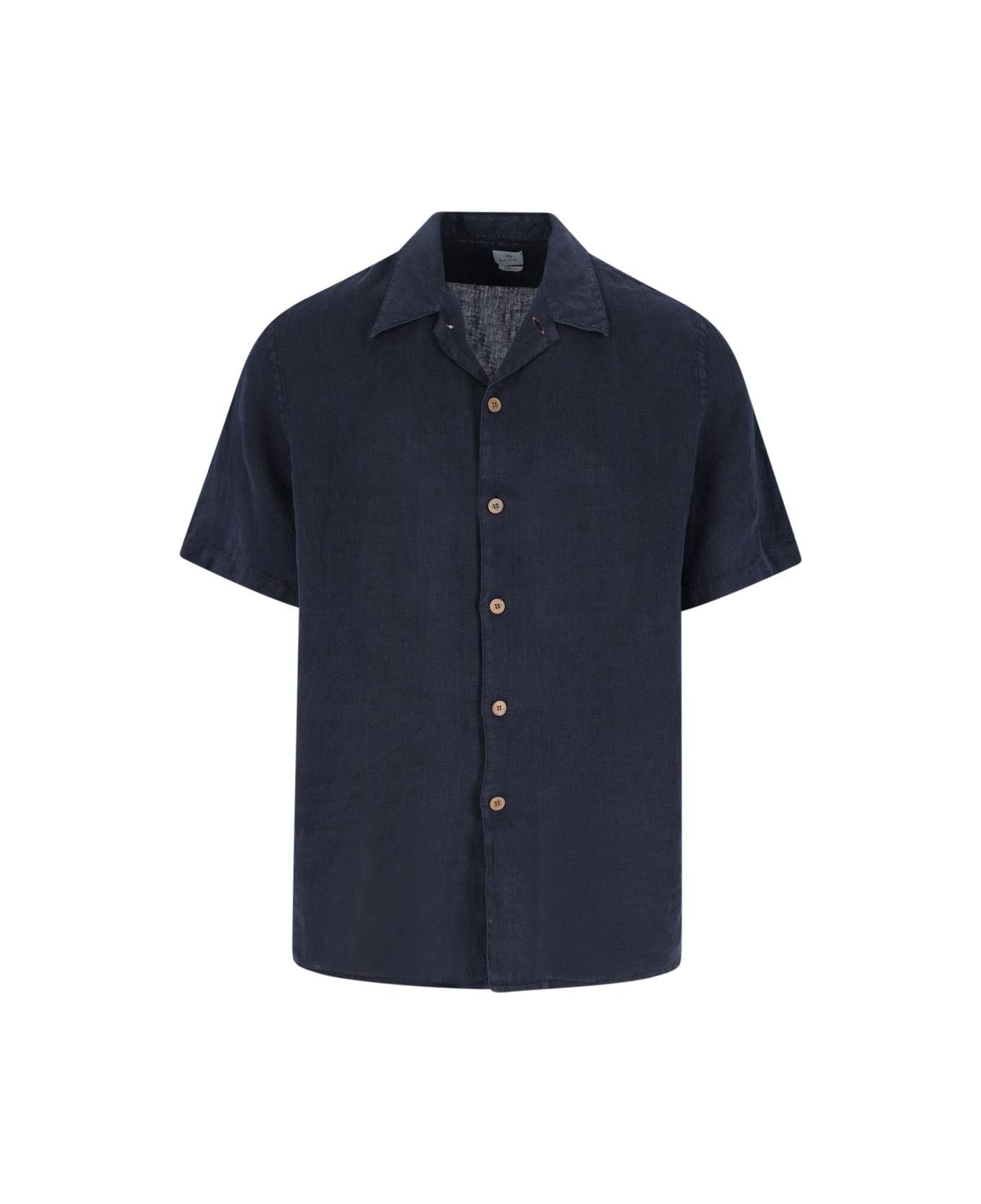 Paul Smith navy blue linen shirt with camp collar, short sleeves, button closure, side logo label, straight hem.