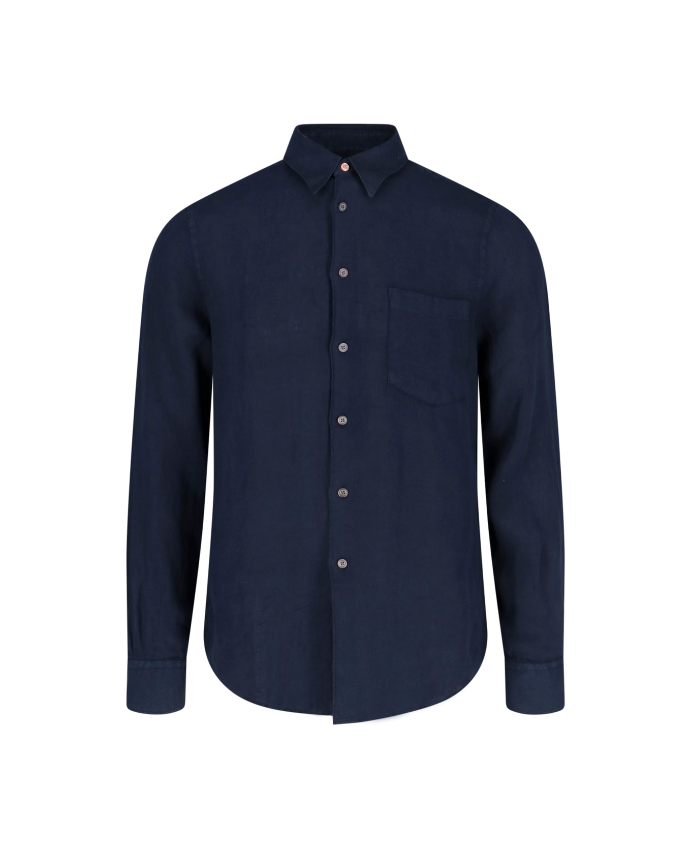 Paul Smith navy blue linen shirt with classic collar, button closure, chest pocket, button cuffs, curved hem.