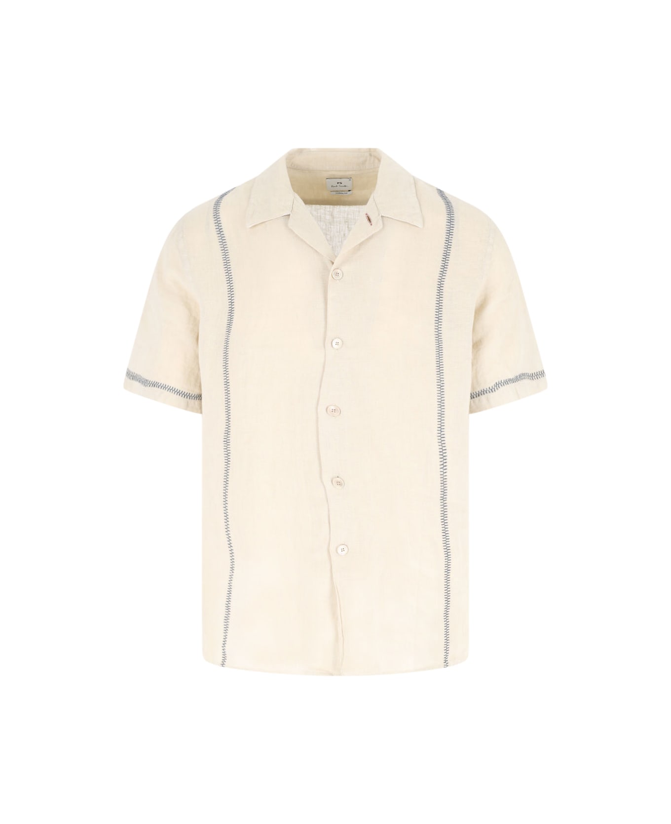 Paul Smith cream linen shirt with light blue stitching, camp collar, short sleeves, button closure, side logo label, straight hem. Composition: 100% Linen