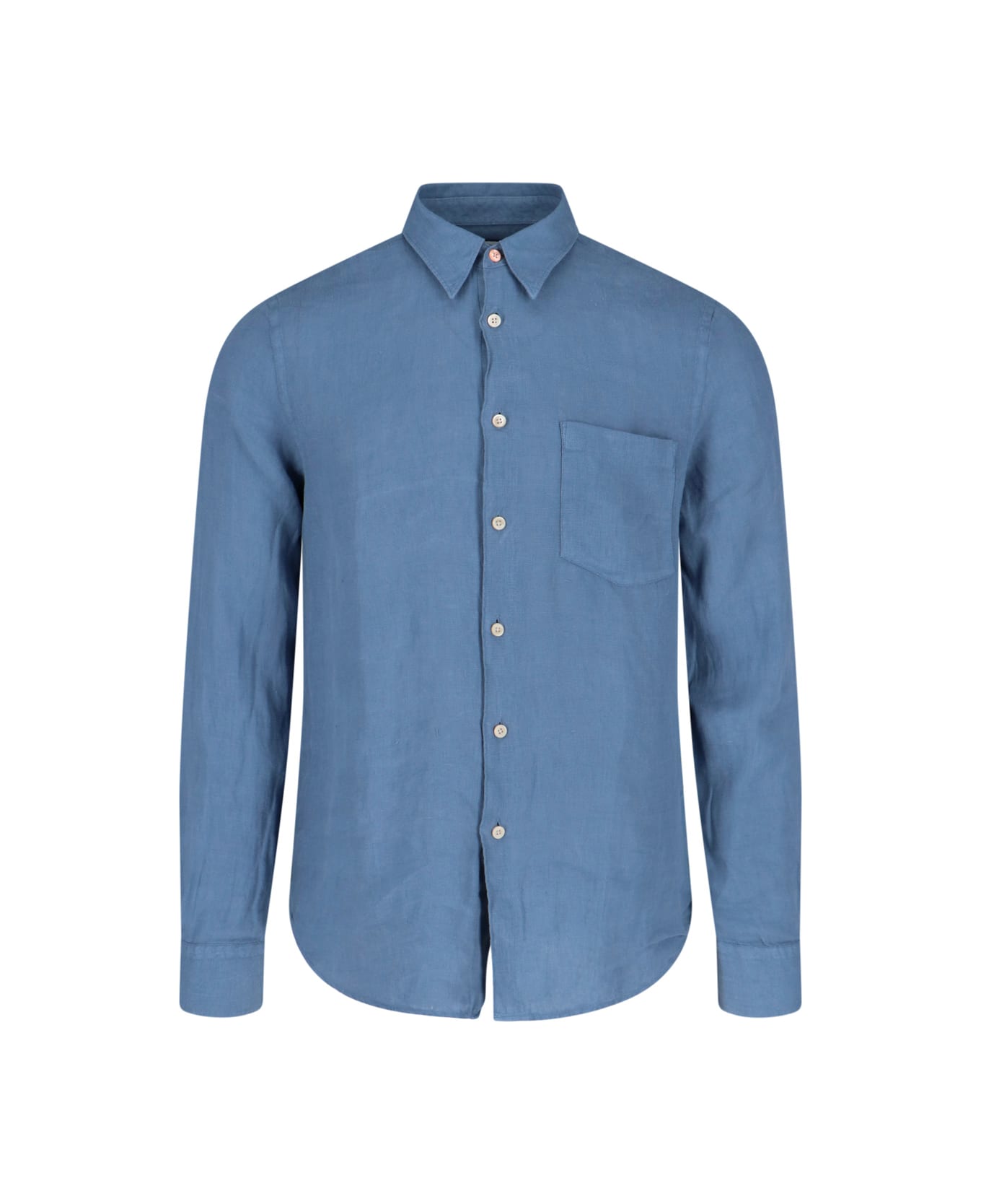 Paul Smith light blue linen shirt with classic collar, button closure, chest pocket, button cuffs, curved hem.