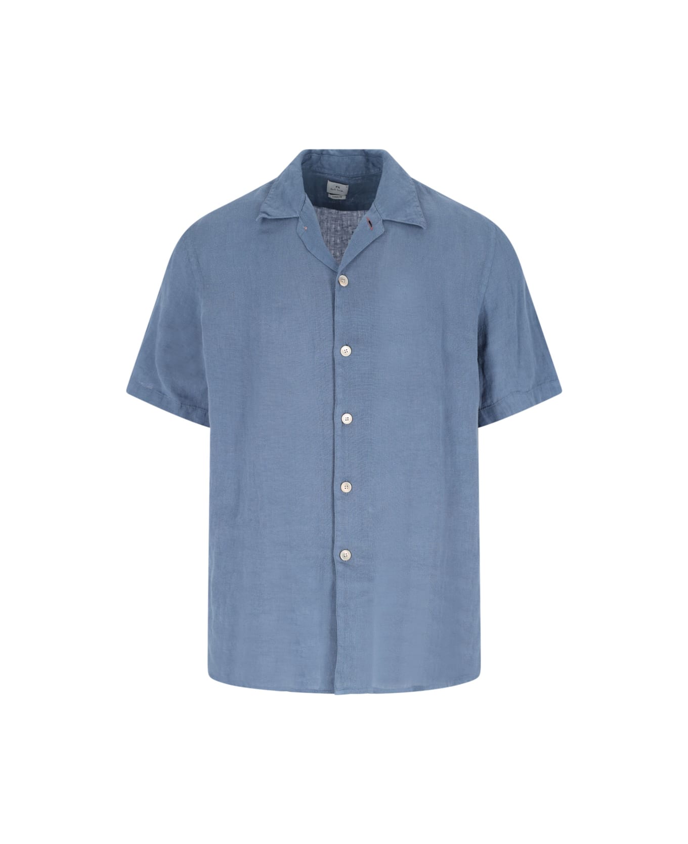 Paul Smith light blue linen shirt with camp collar, short sleeves, button closure, side logo label, straight hem.