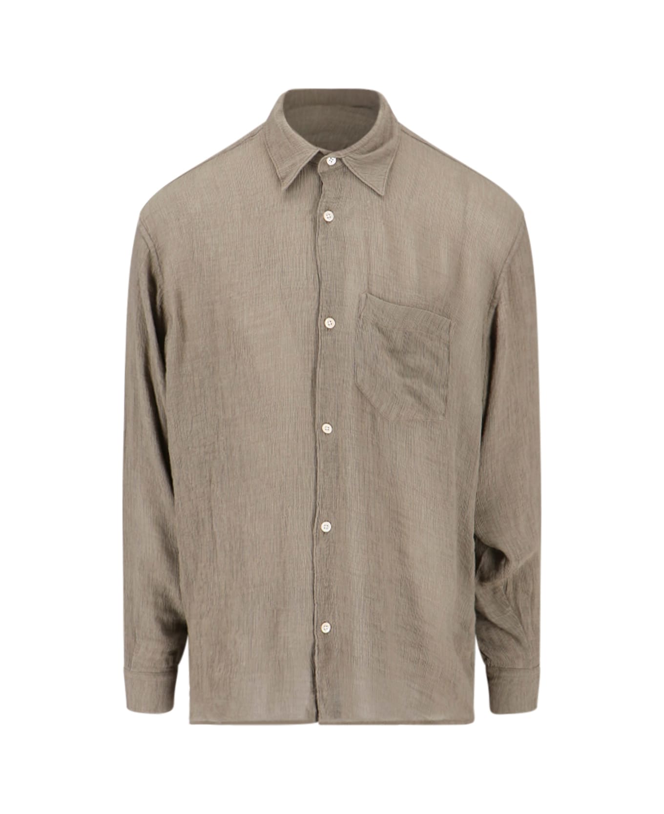 Our Legacy Initial shirt in brown viscose blend with classic collar, button closure, chest patch pocket, button cuffs, straight hem.