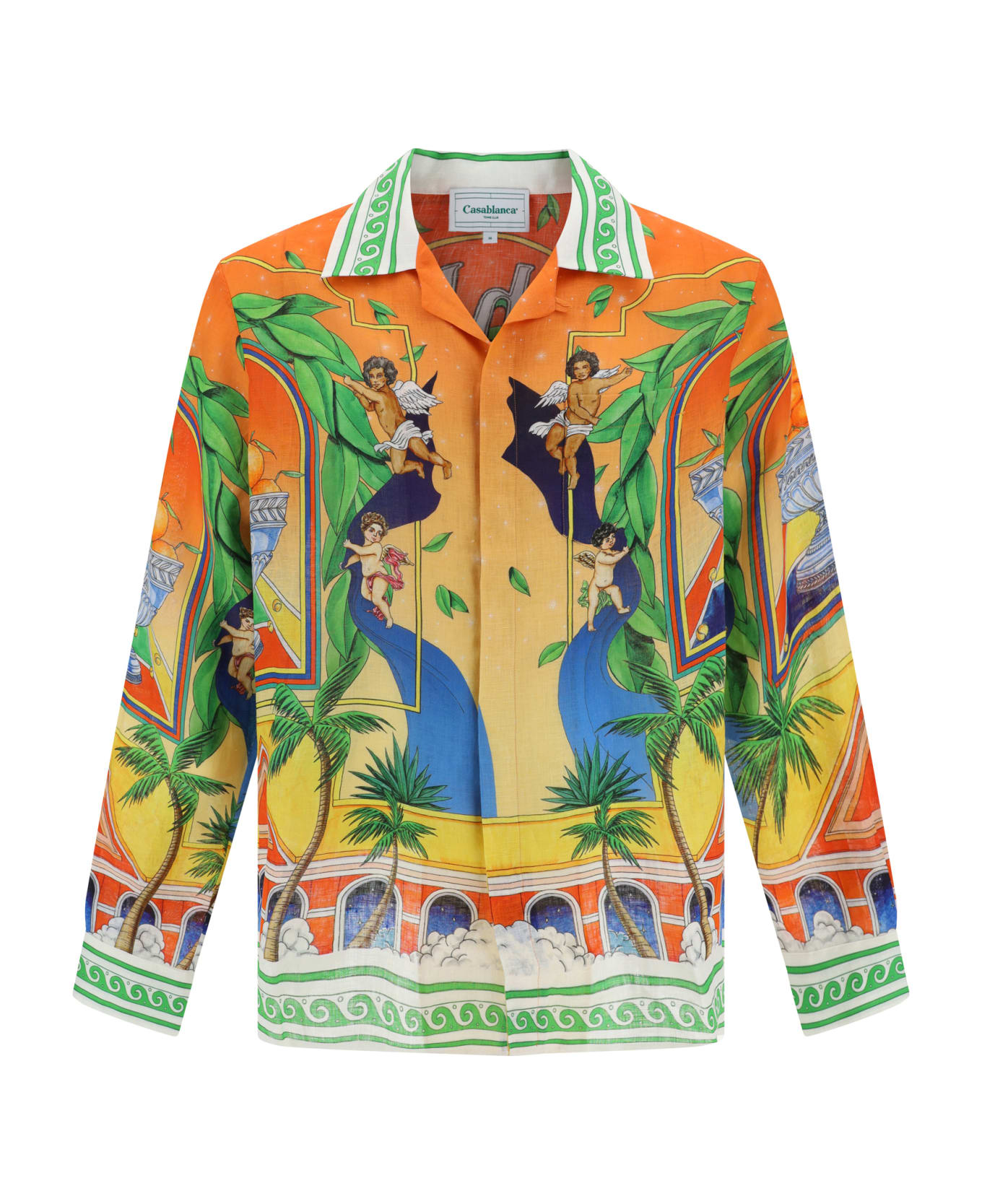 Linen shirt by casablanca, featuring a classic collar, a concealed front button closure, a front patch pocket, a long-sleeved design, an all-over applied multicolored graphic print, an iconic brand monogram detail printed on the back, and a regular fit.