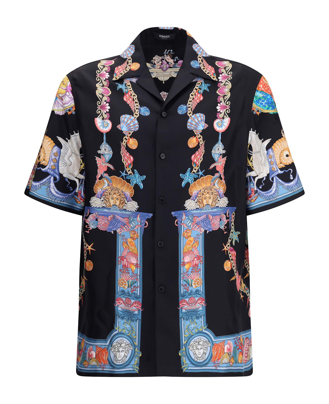 Versace's silk theatre shirt is a short-sleeved design with a cuban collar and front button closure. the exclusive print depicts corals, shells and mermaids, enhanced by theatrical elements that express the maison's deep connection with the dramatic arts. two side slits complete the design for a fluid and refined fit. Composition: 100% % Silk